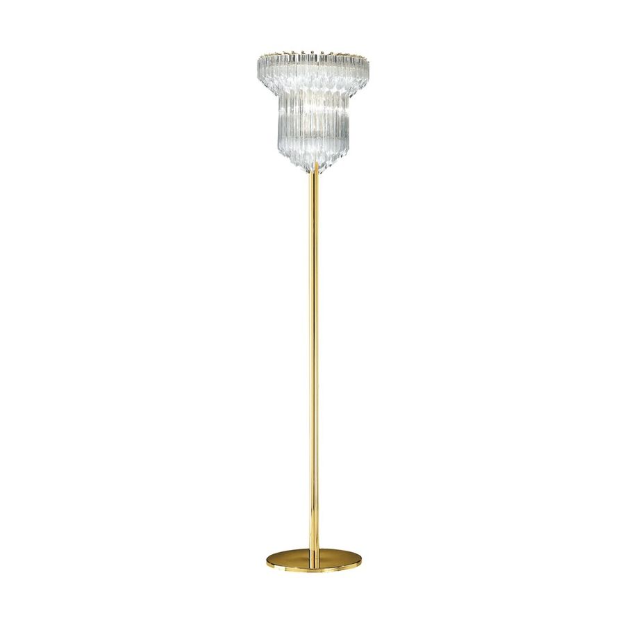 Floor lamp with crystal trihedrals or trihedrals and quadrihedrals in murano glass, available in many colours and a frame in 24 karat polished gold or chrome.