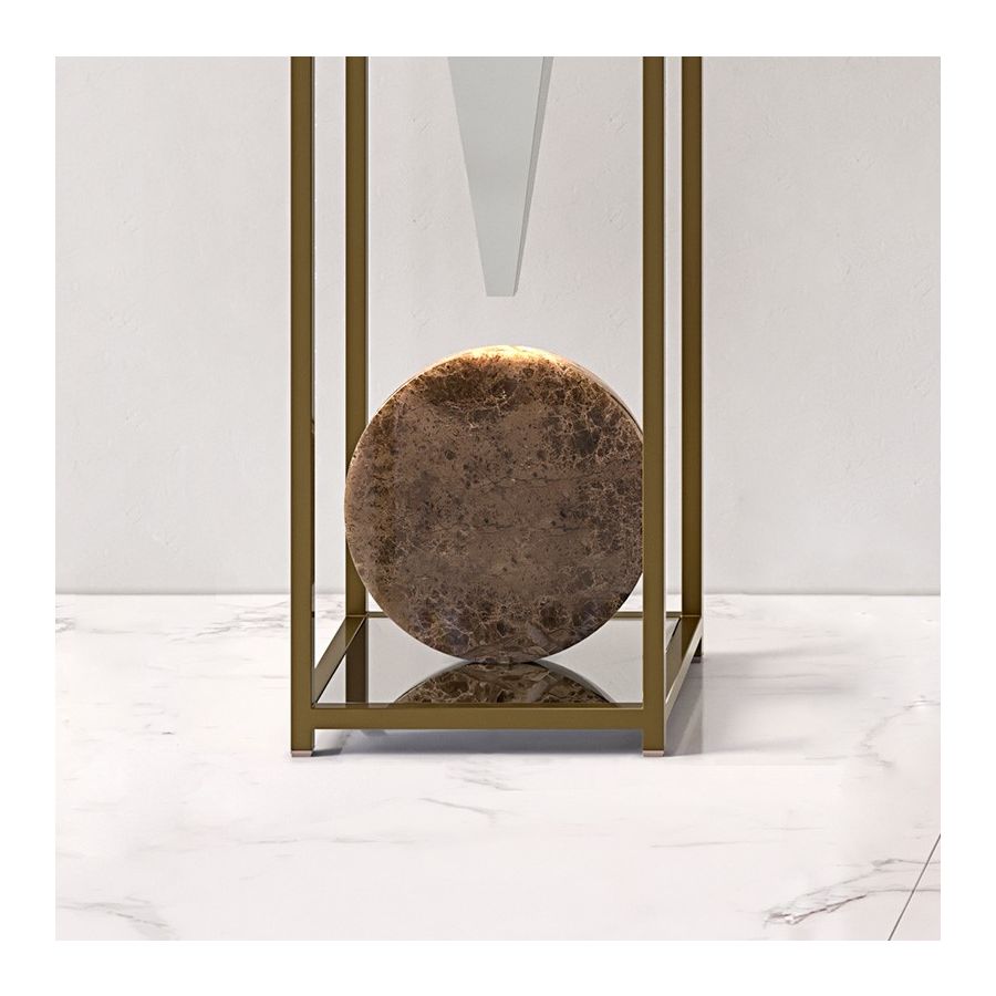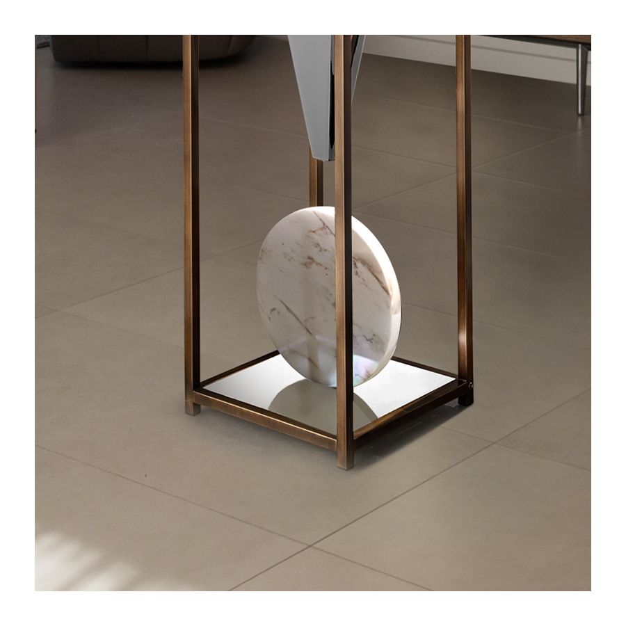 The metal frame, which is very minimal and discreet to emphasise the glass at its best, is refined shiny-mirror finish, the bearing structure is refined in burnished brass, dove gray or iron gray.