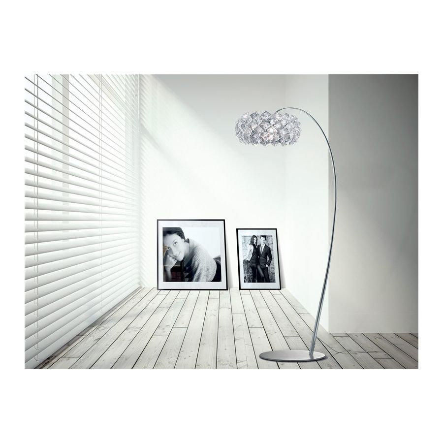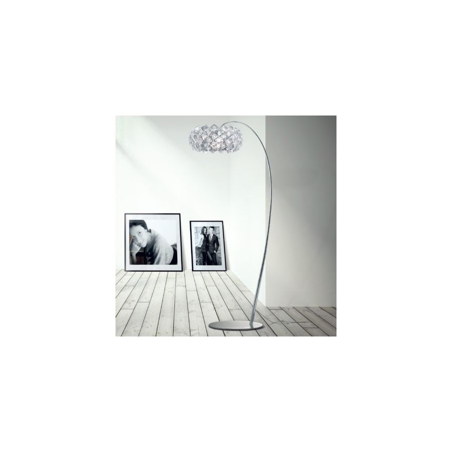 Floor lamp with a diffuser in clear acrylic, multifaceted, very bright and extremely light, of round shape.
