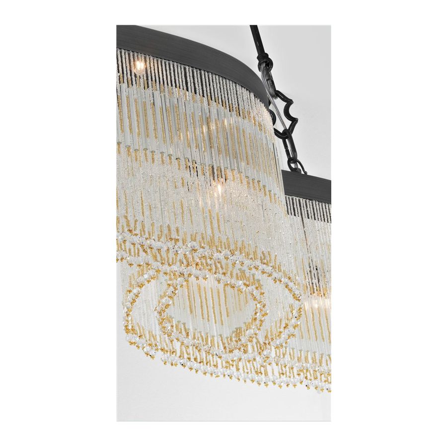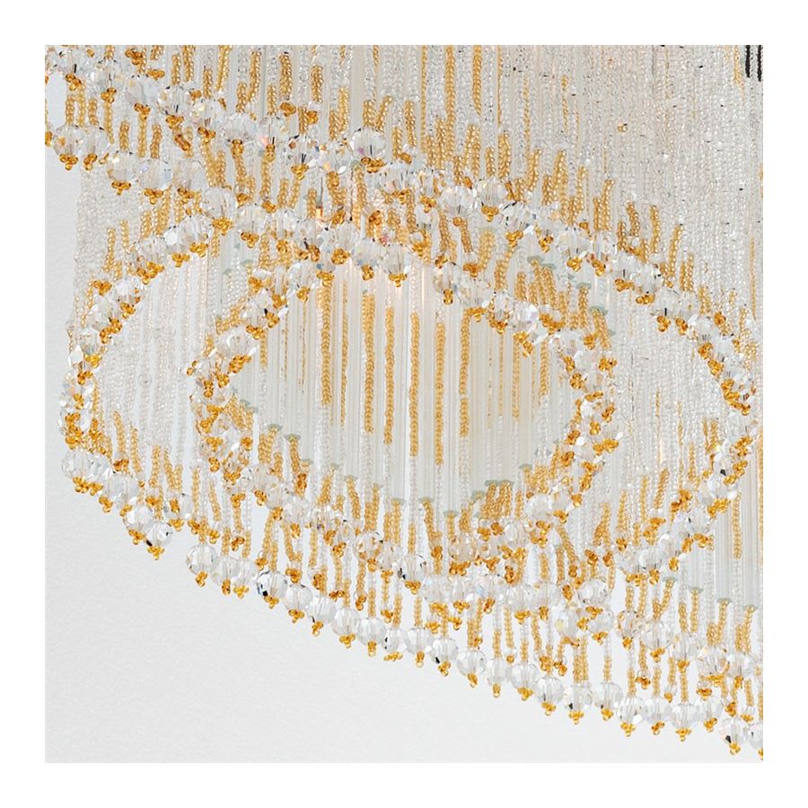 Decorative fringe formed by tiny beads made of murano glass, ultra-pure crystal rods and crystal pearls, all assembled and sewn by hand according to the venetian tradition.