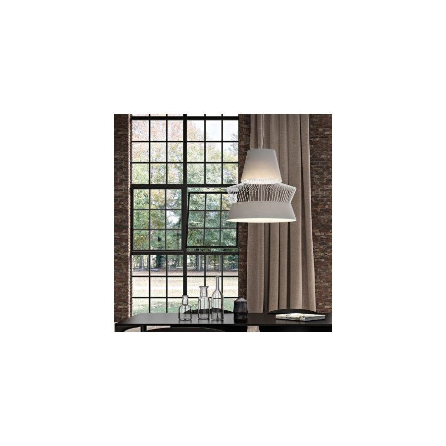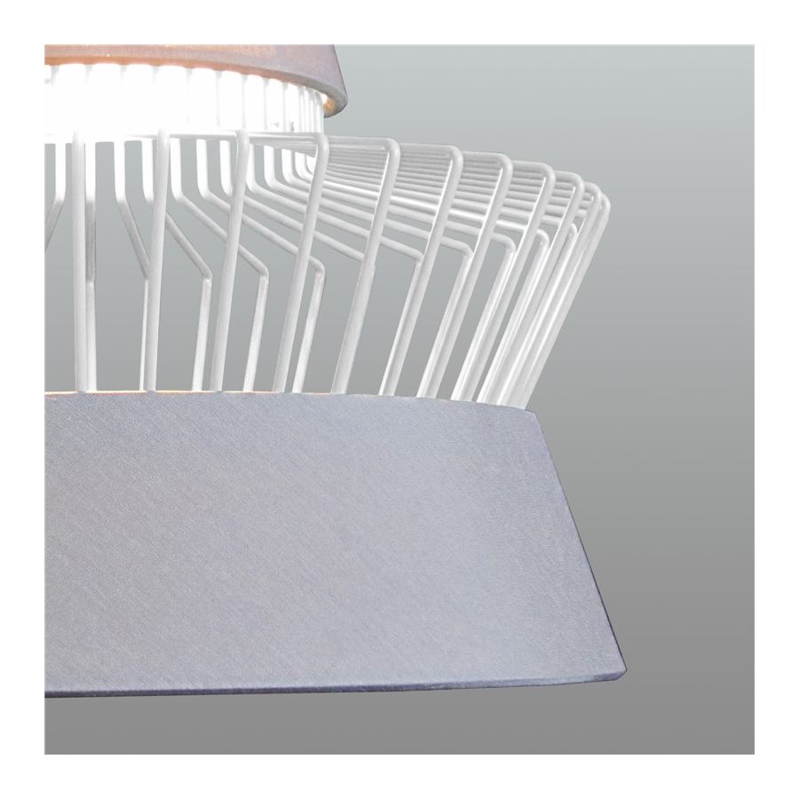 Pendant lamp with a decorative cage, a lampshade and a metal frame, in different finishes and colours. Modern and contemporary design.