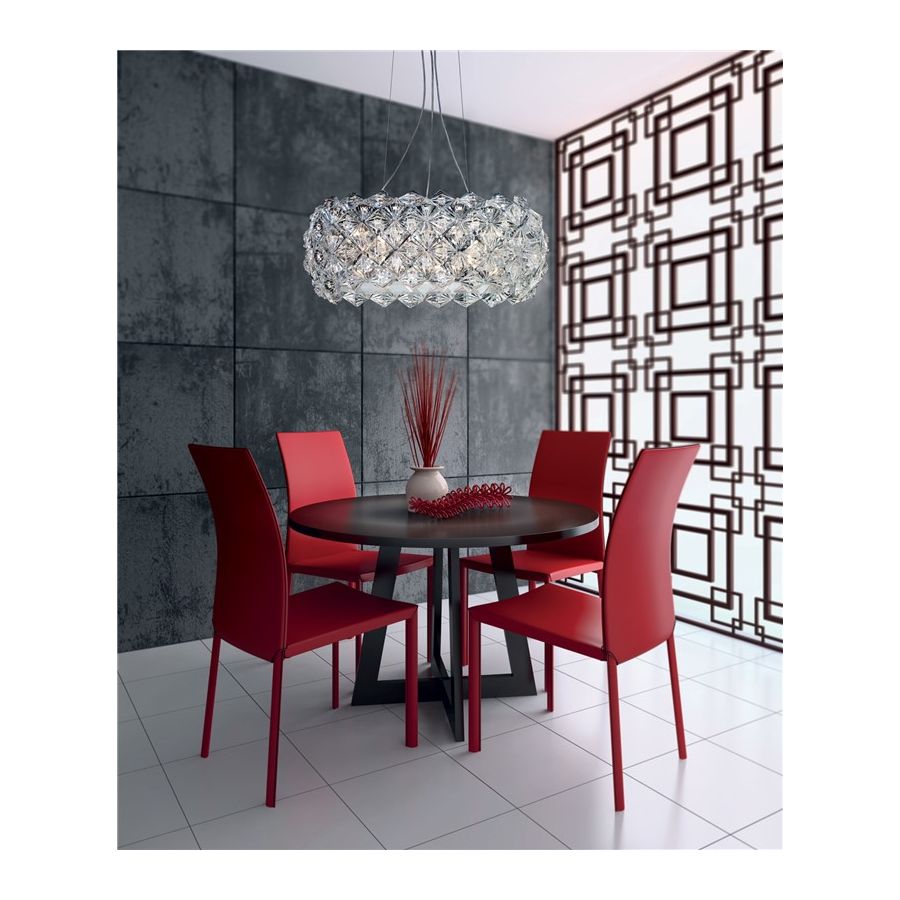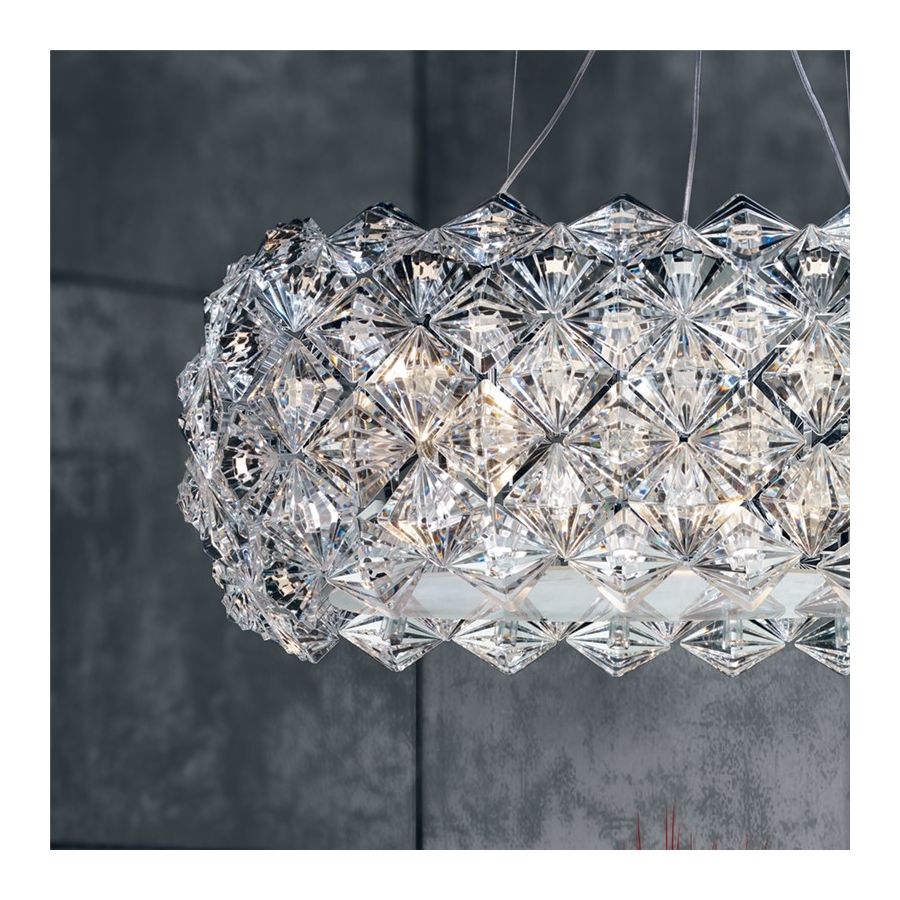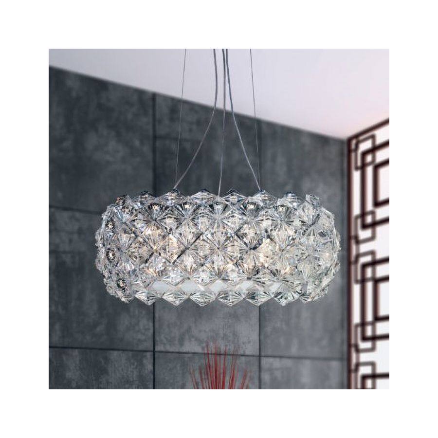 Round chandelier with multifaceted acrylic diffuser, brilliant and very light in weight. Pendant lamp with a modern and refined design.
