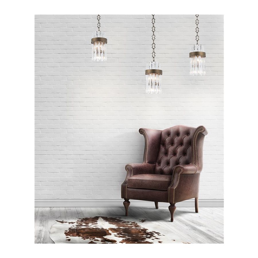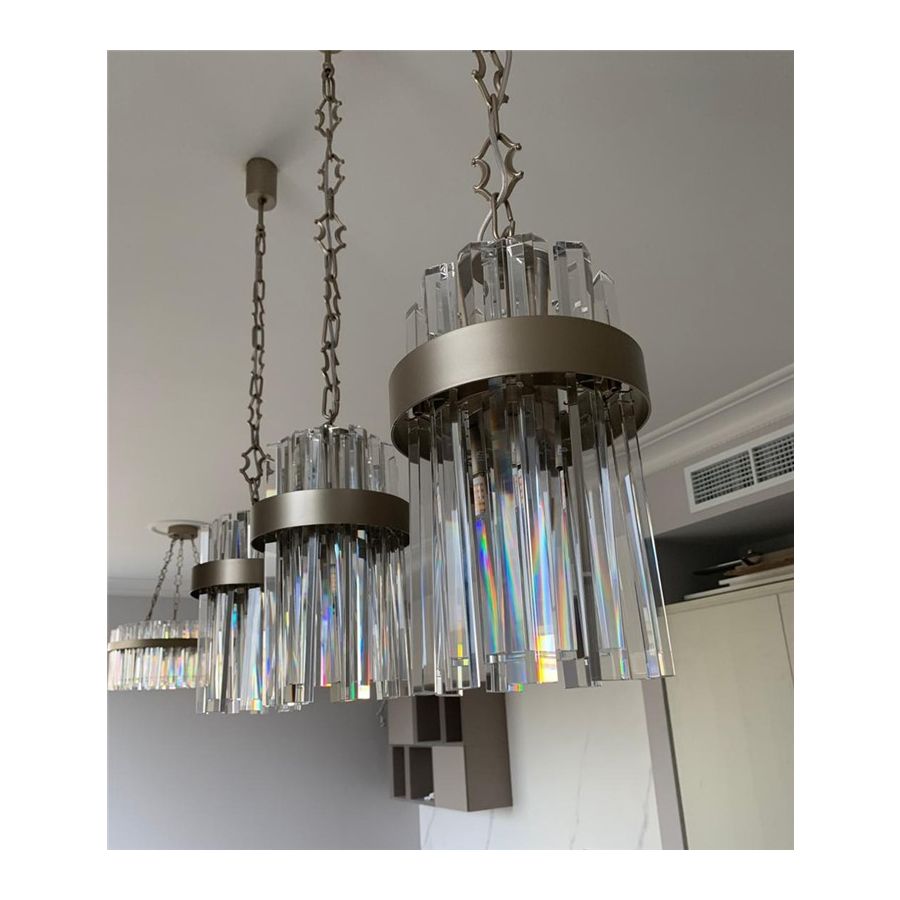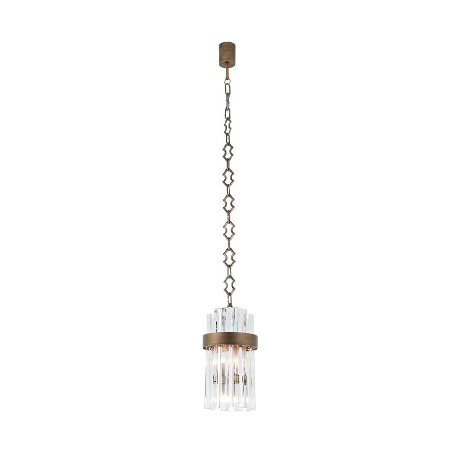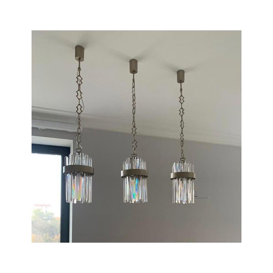 Luminous pendant lamp in clear crystal with a metal frame available in burnished brass, dove grey and brushed grey.