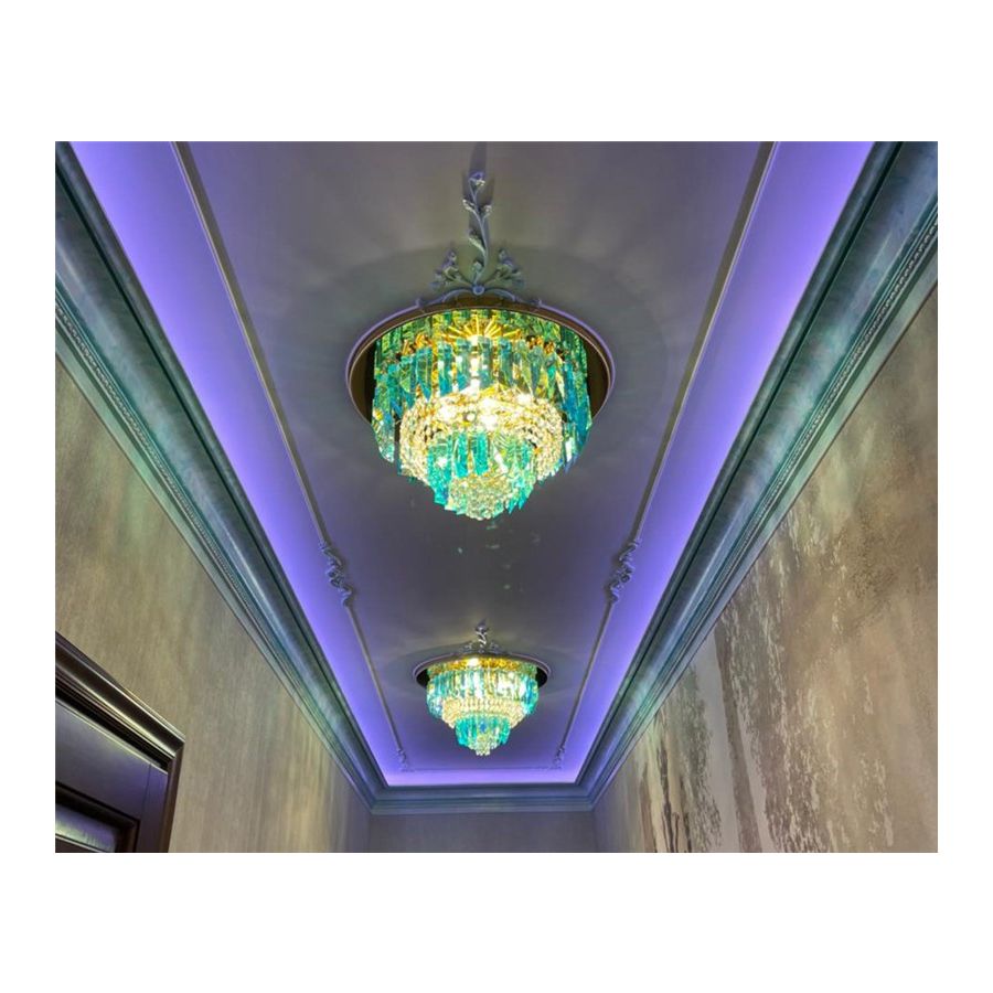 Modern design ceiling light with metal structure with polished chrome or 24-karat gold finish. Rods in coloured glass or optical crystal
