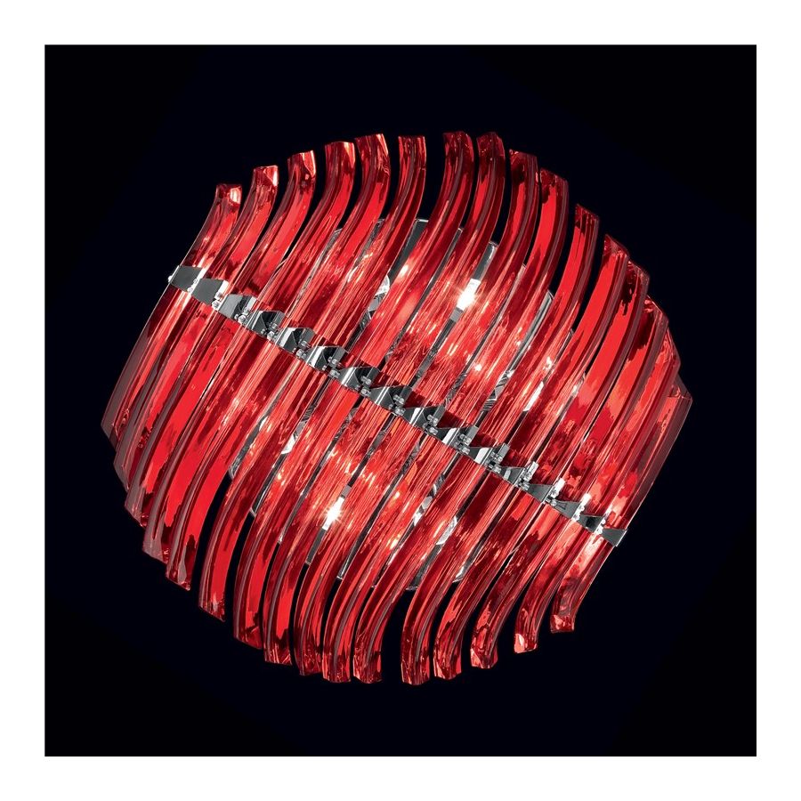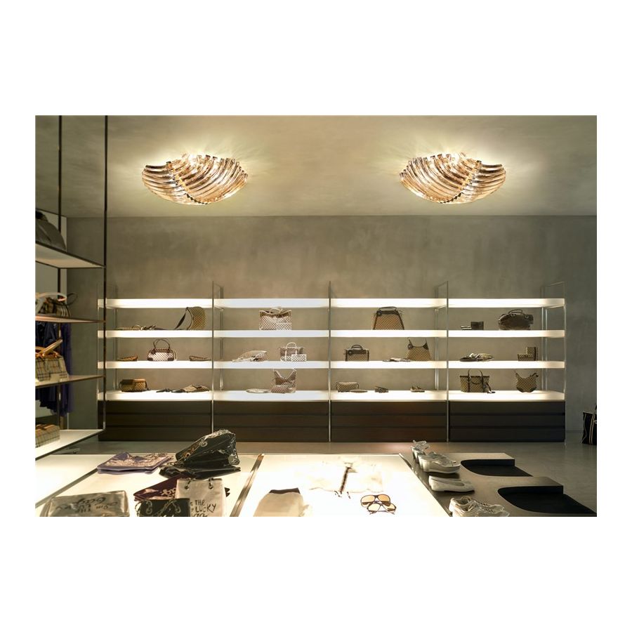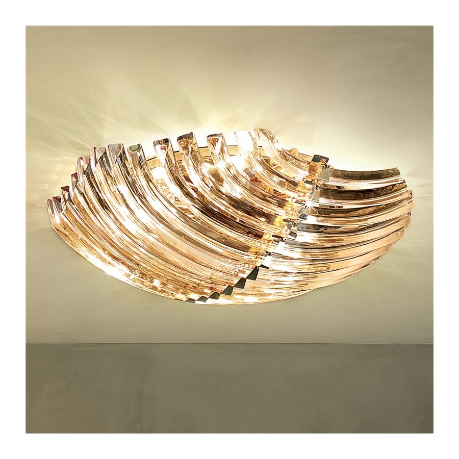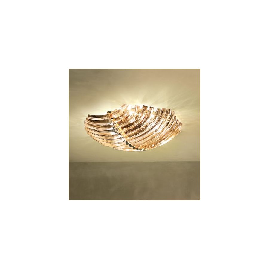 Modern ceiling light available in different colours with heat-curved murano glass. Polished 24 karat gold or polished chrome finish.