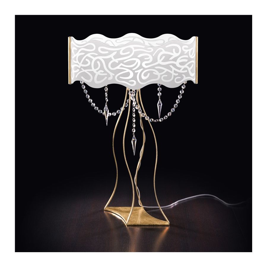 Table lamp in milk white engraved curved glass, frame with gold or silver leaf and pendants in swarovski crystal.