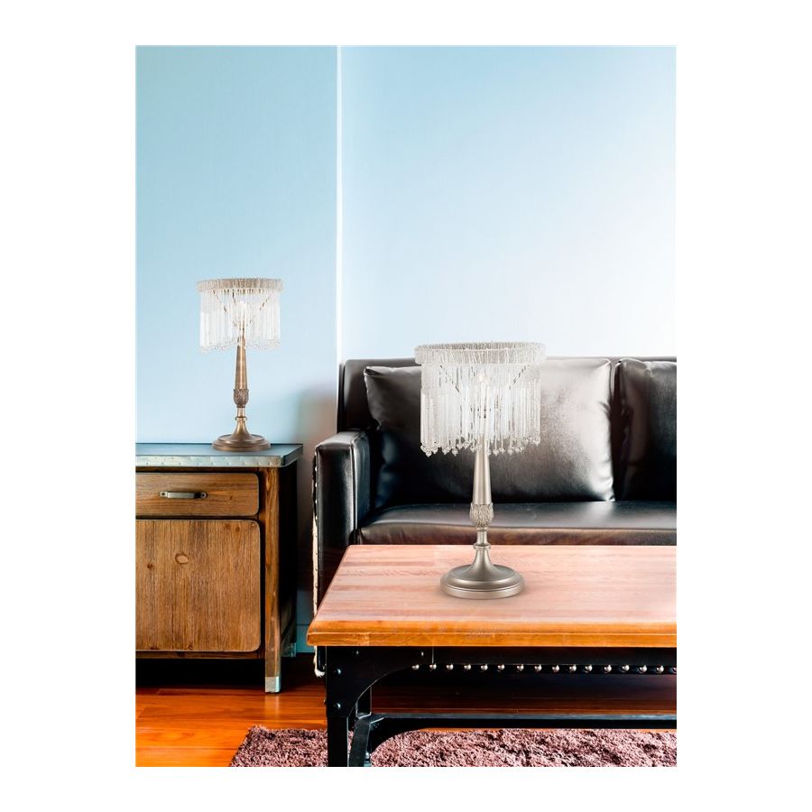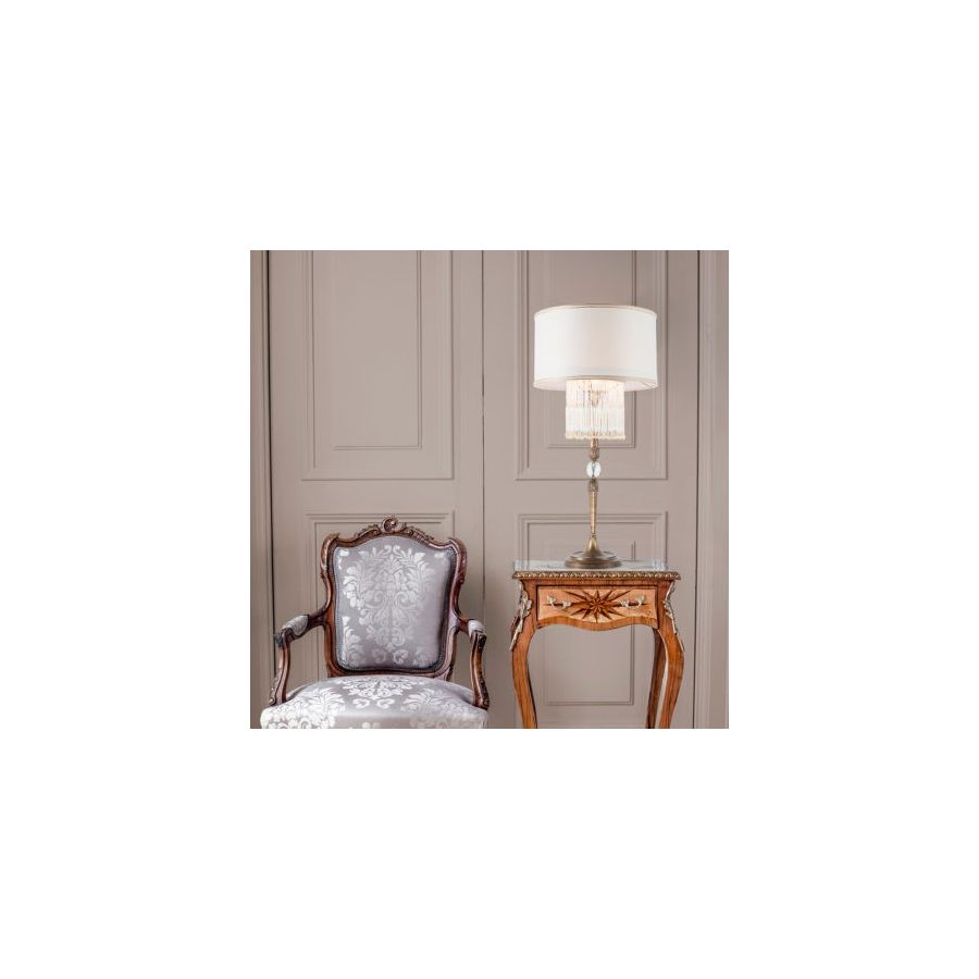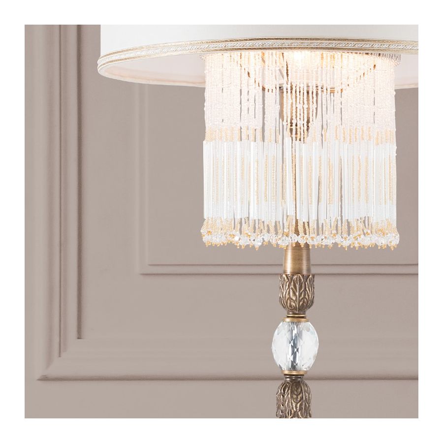 Table lamp with a handcrafted fringe formed by murano glass clear or amber beads and a frame in bronze, dove grey or grey.