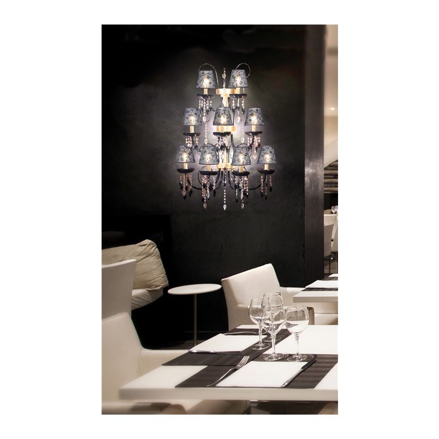 Wall light with crystal pendants, glass croziers and lampshade in various types of fabric. Wall light available in different options