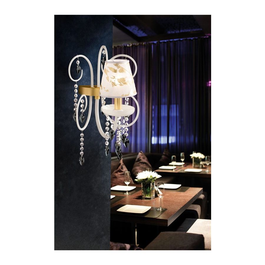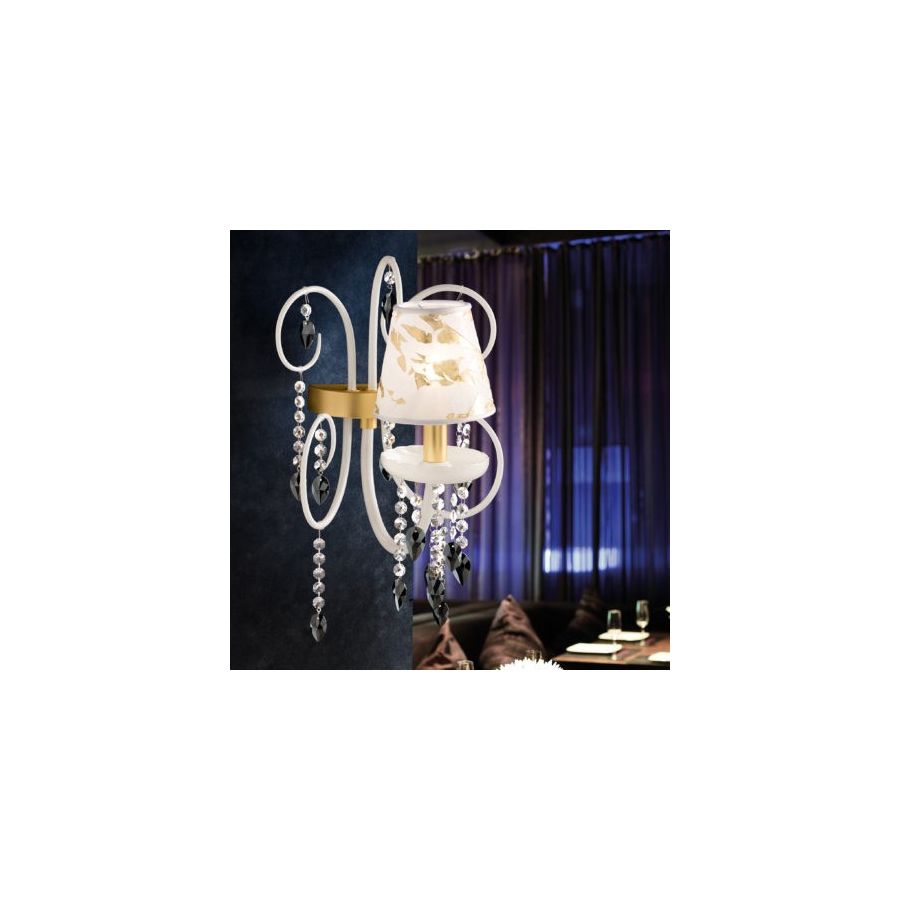 Wall light in hand-blown Murano glass with glass croziers and multifaceted crystal pendants. Wall light with lampshade available with different finishes, colours and types of fabric.