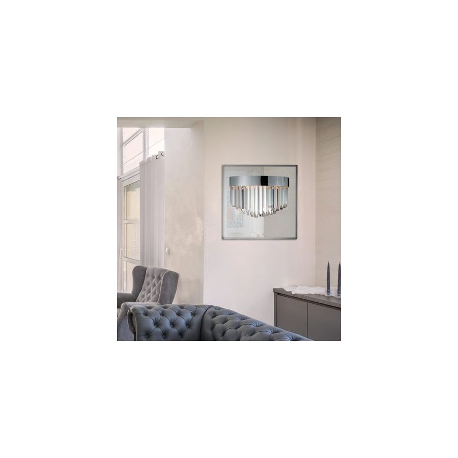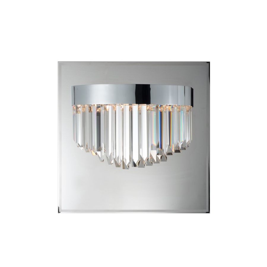 Wall lamp with clear optical crystal rods and stainless steel frame with burnished brass, dove grey and polished chrome finish.