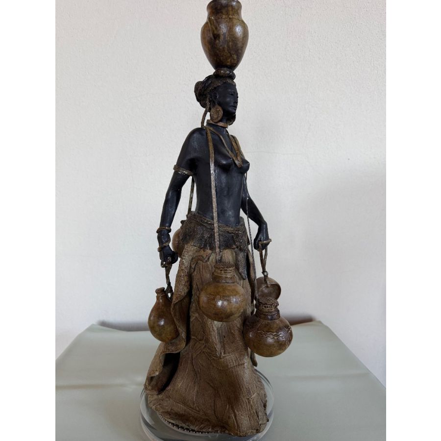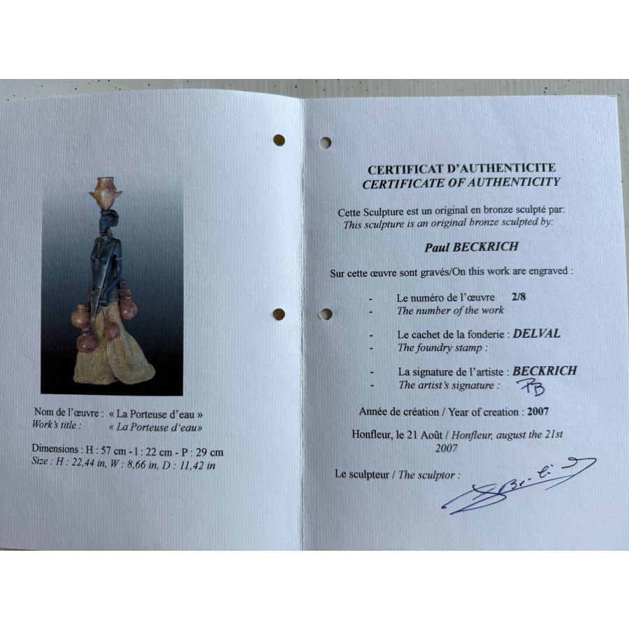 La Porteuse d’Eau is an original bronze sculpture created in 2007 by the renowned French sculptor Paul Beckrich at his studio in France. The artwork depicts a graceful female figure carrying multiple water vessels — a timeless symbol of balance, daily ritual, and cultural tradition. The elongated proportions and refined detailing reflect Beckrich’s distinctive artistic language, combining elegance with quiet strength.