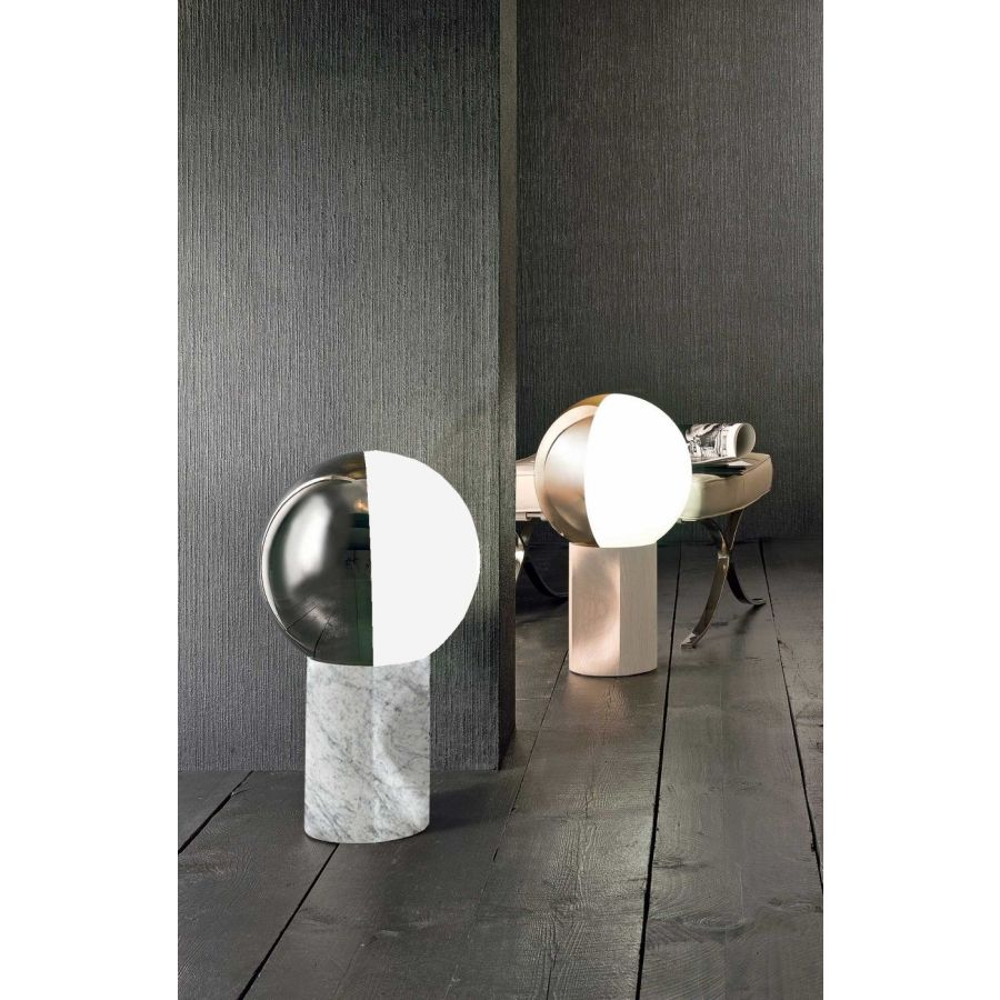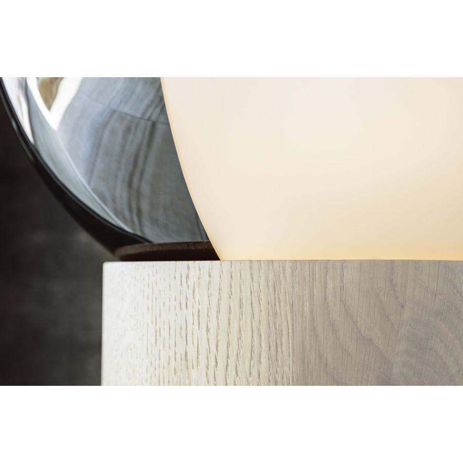 Floor and table lamp with base in: oak, stained anthracite wood or Carrara white marble. 360° turning bicolor blown glass shade in white/ silver.
