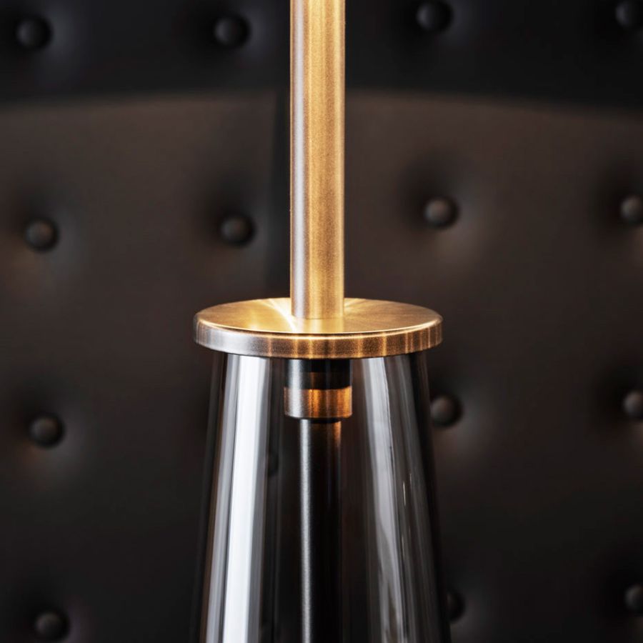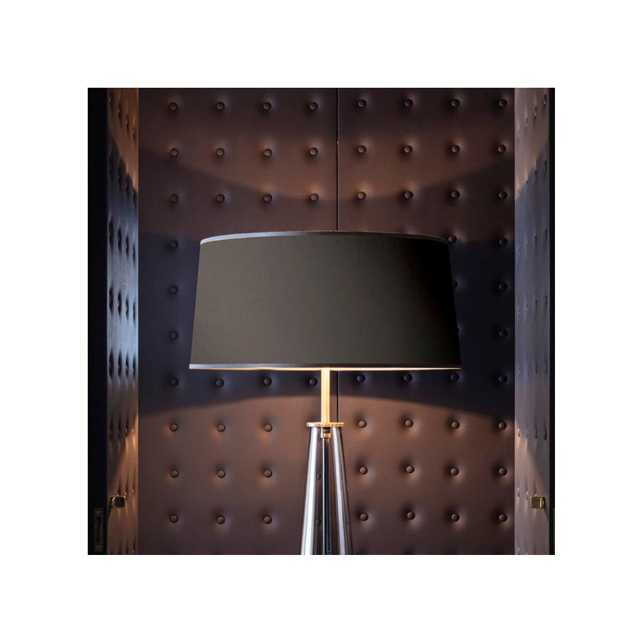 Glamorously reinventing the table lamp, New classic has a glass bottle in different shapes as a base and a shade of fabric or translucent material, for a fresh,