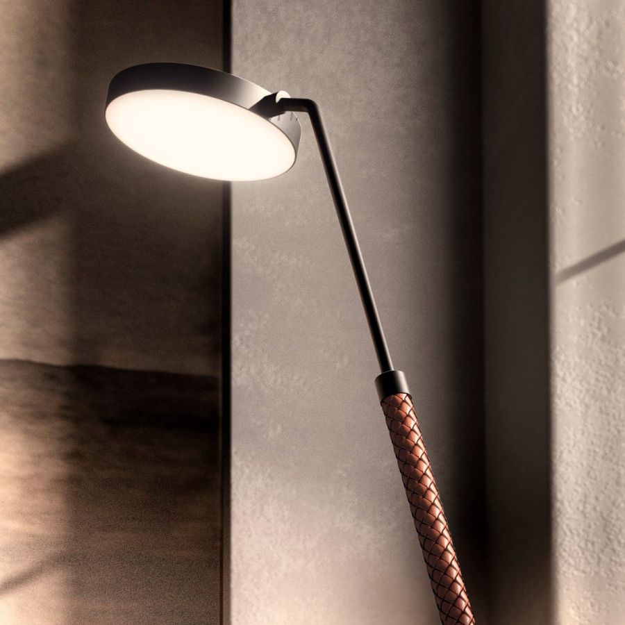 Lamps with structure in matt black metal or grey metal. Hand-woven leather in black or cognac available for the matt black metal finish only.