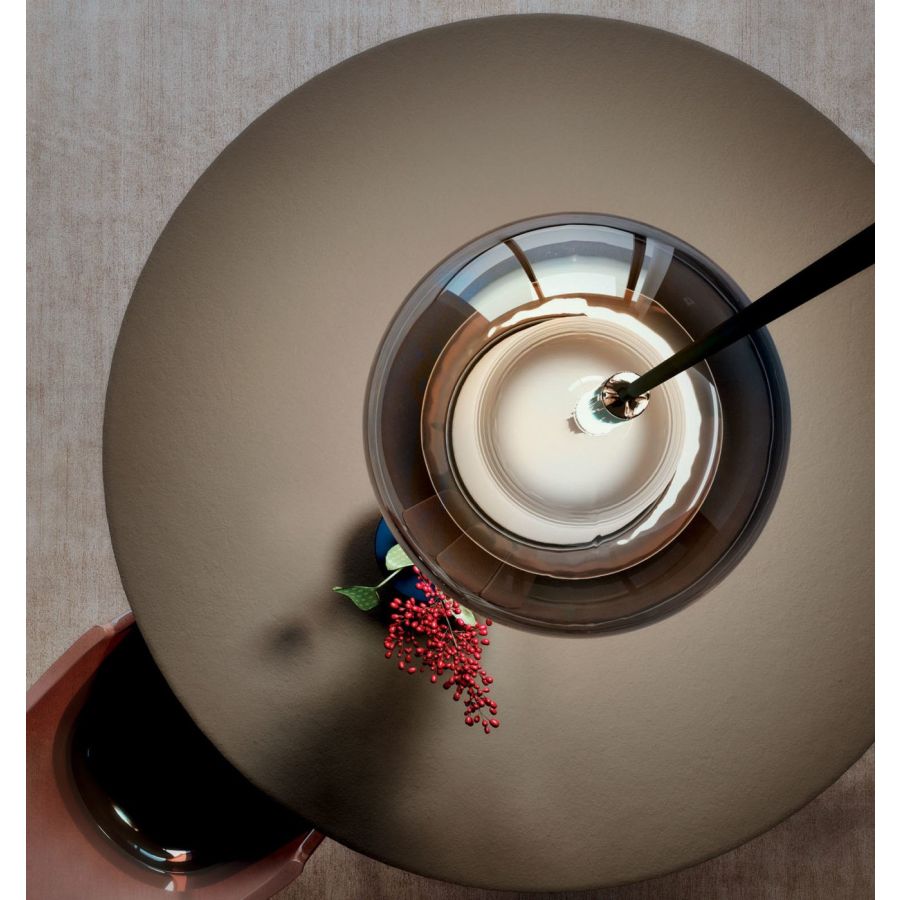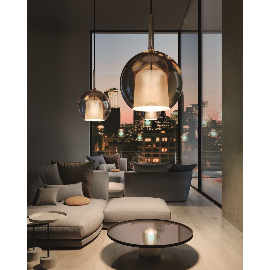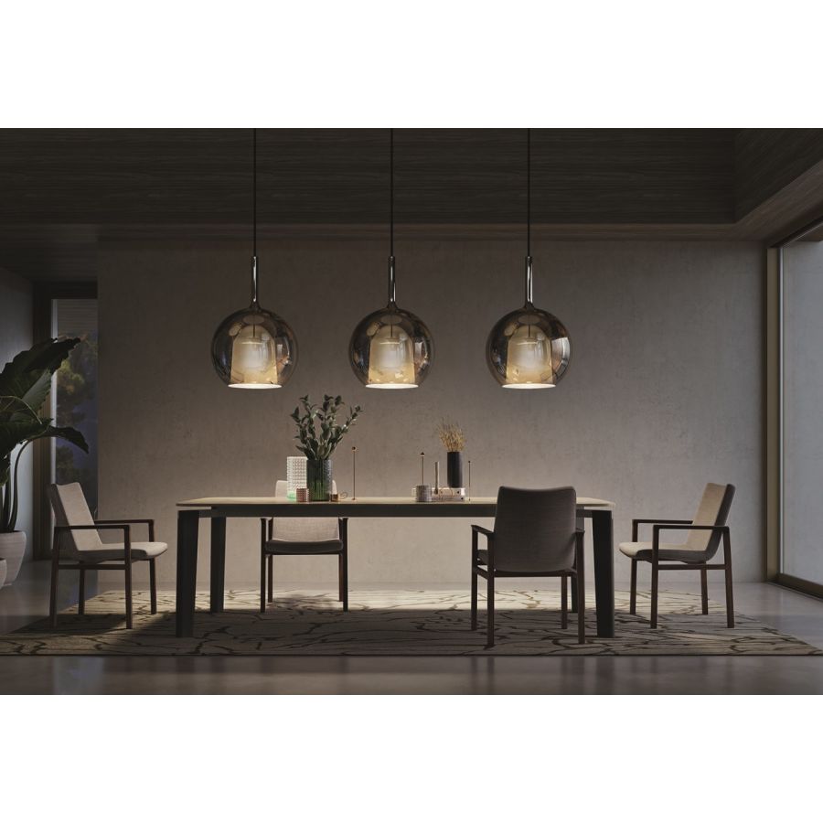 Lamps with chromed metal structure and borosilicate glass. Outer shade transparent, gold, silver, rose gold, black, 4ever, bronze, green, blue and violet. Inner shade sandblasted. Canopy in titanium, white and black metal.