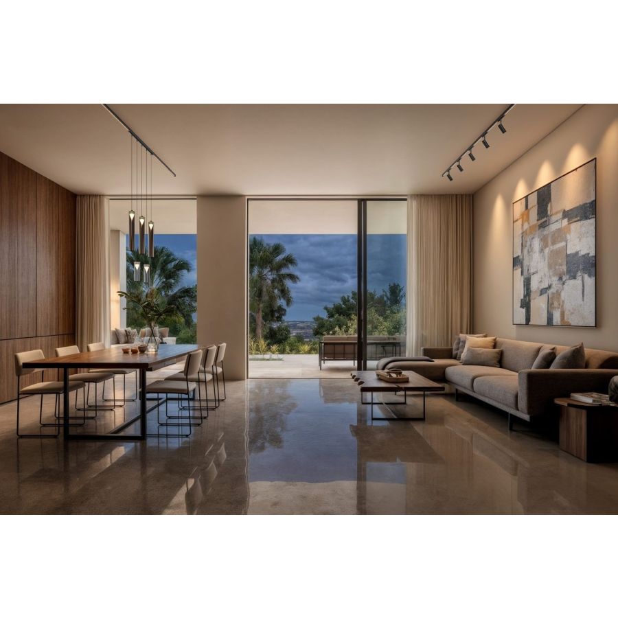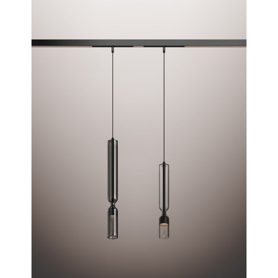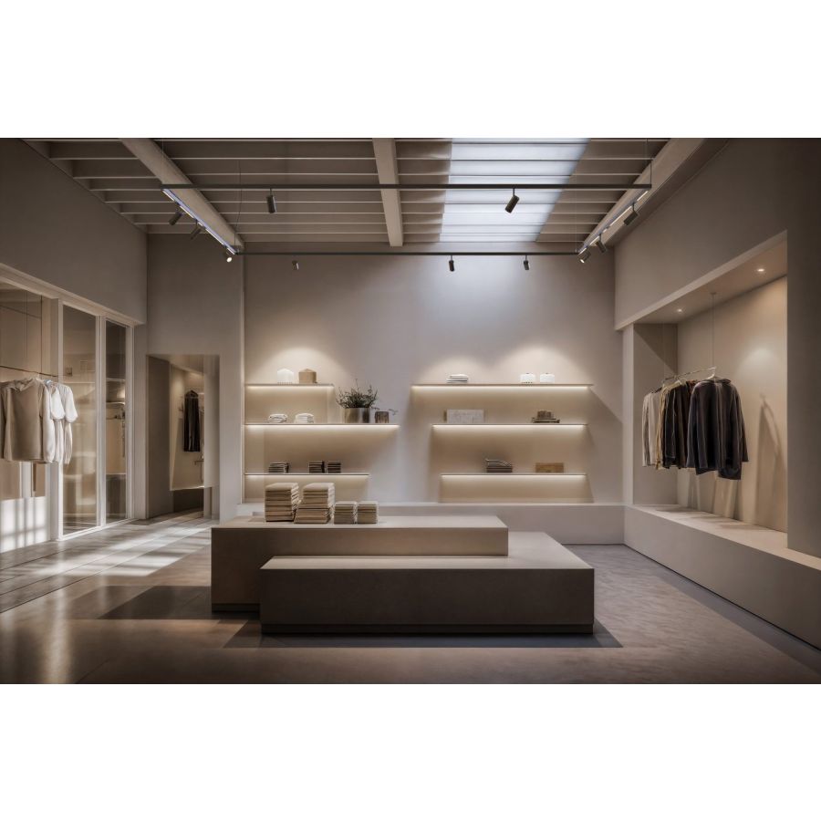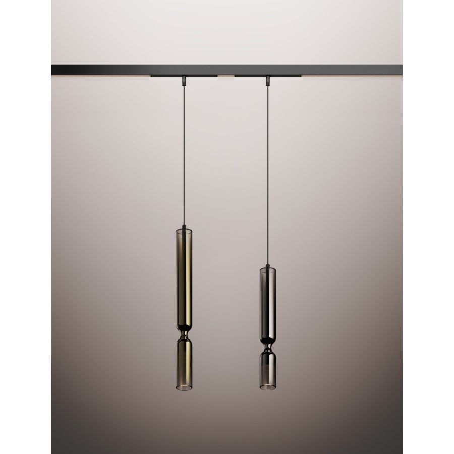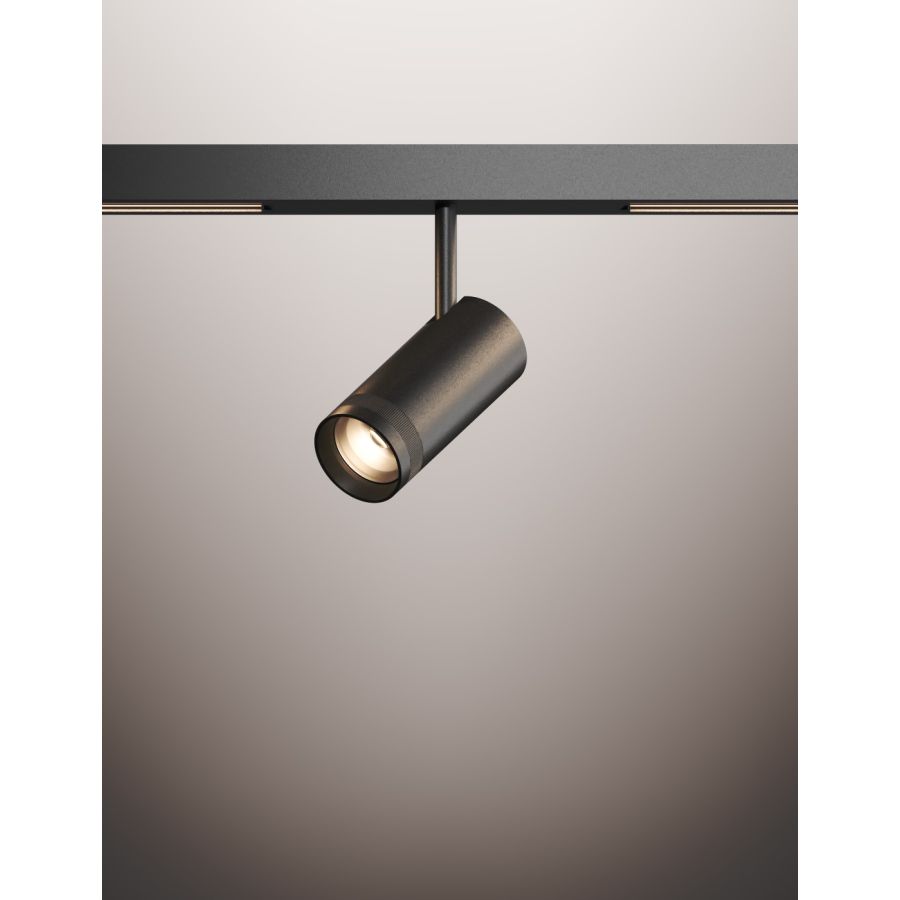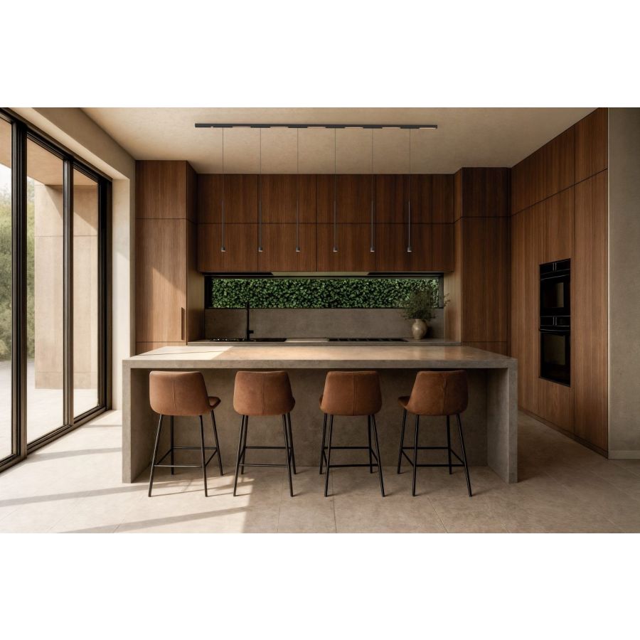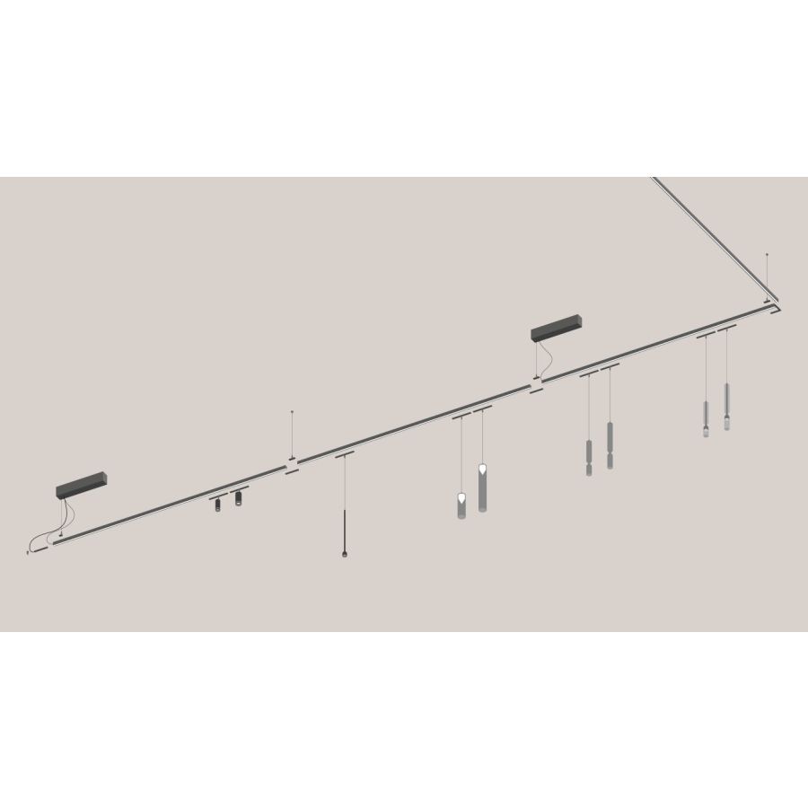 On this luminous track, 48V spots and pendants can be freely integrated – technical or decorative solutions that blend seamlessly to create customized compositions, either suspended or ceiling-mounted.