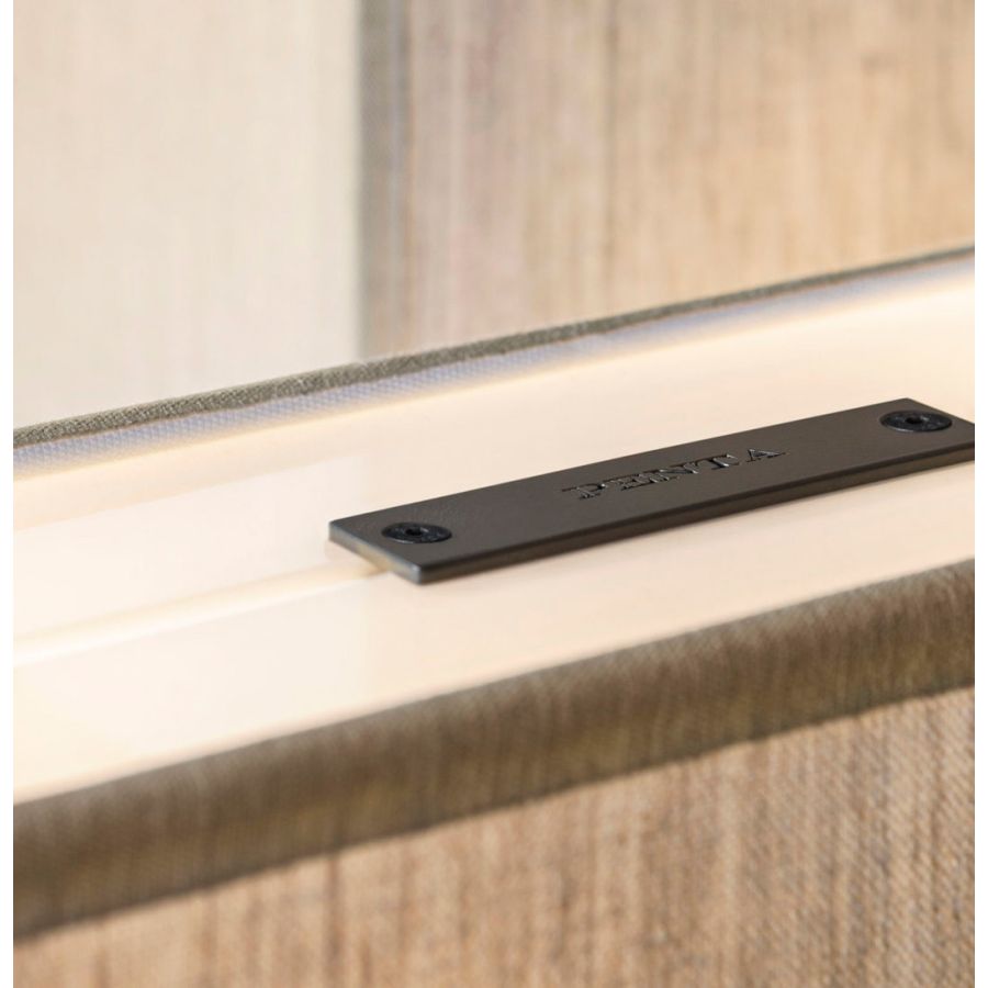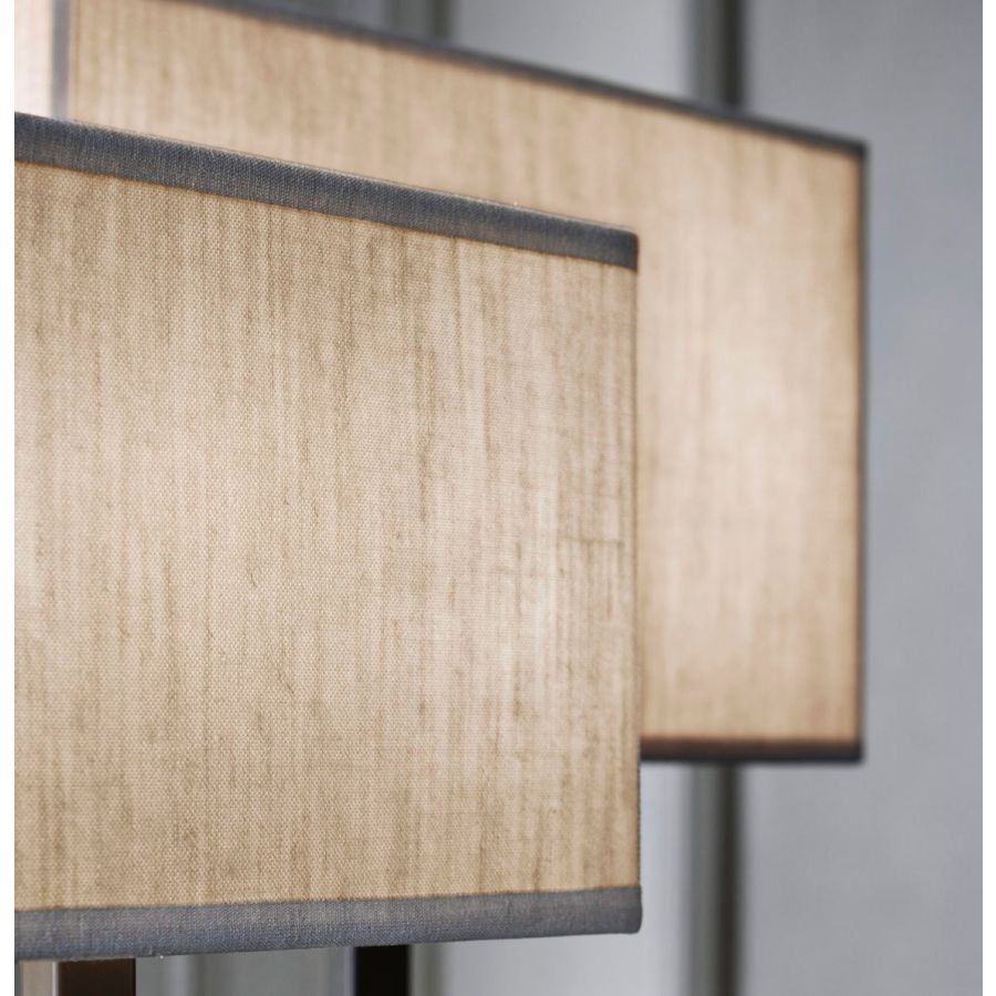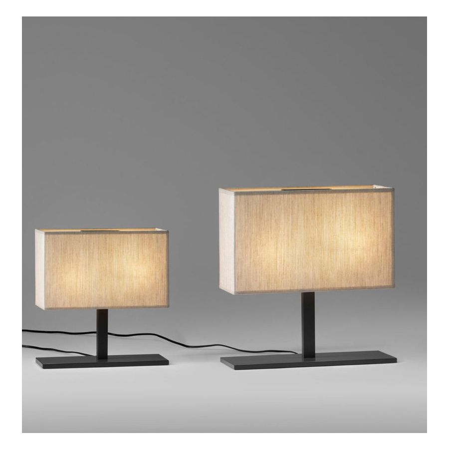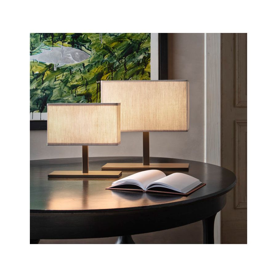 A minimal metal support sustains a rectangular fabric shade in this floor or table lamp which shows all the elegance of simplicity, for a light effect of great atmosphere.