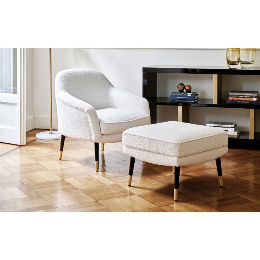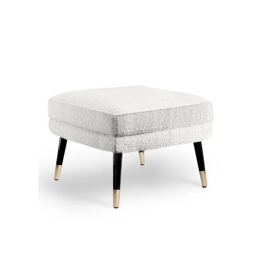 Bekväm och avslappnad i sittet, fascinerar den med den förfinade formen på benen, vars lackade trä mynnar ut i en metallspets: en förförisk och självsäker detalj. Bernadette Pouf är en del av Bernadette-familjen av sittmöbler som inkluderar matstol, matbänk, barstol, fåtölj, liten soffa och puff.