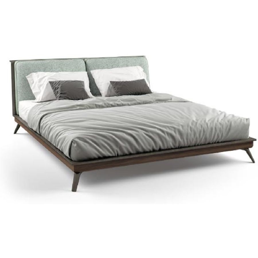 Bed with headboard in MDF coated poplar plywood with lacquered finish. Cushions upholstered in polyurethane foam and goose down, removable covers. Bed base in solid black walnut. Feet in painted metal. All upholstery is available in leather, synthetic leather or fabric.