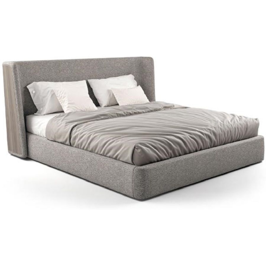 Bed with headboard in solid beech and poplar plywood. Headboard with insert in black walnut on the side and front padded with polyurethane foam. All the upholstered elements are available in leather, synthetic leather or fabric. Upholstery not removable. Available lift up storage base version.