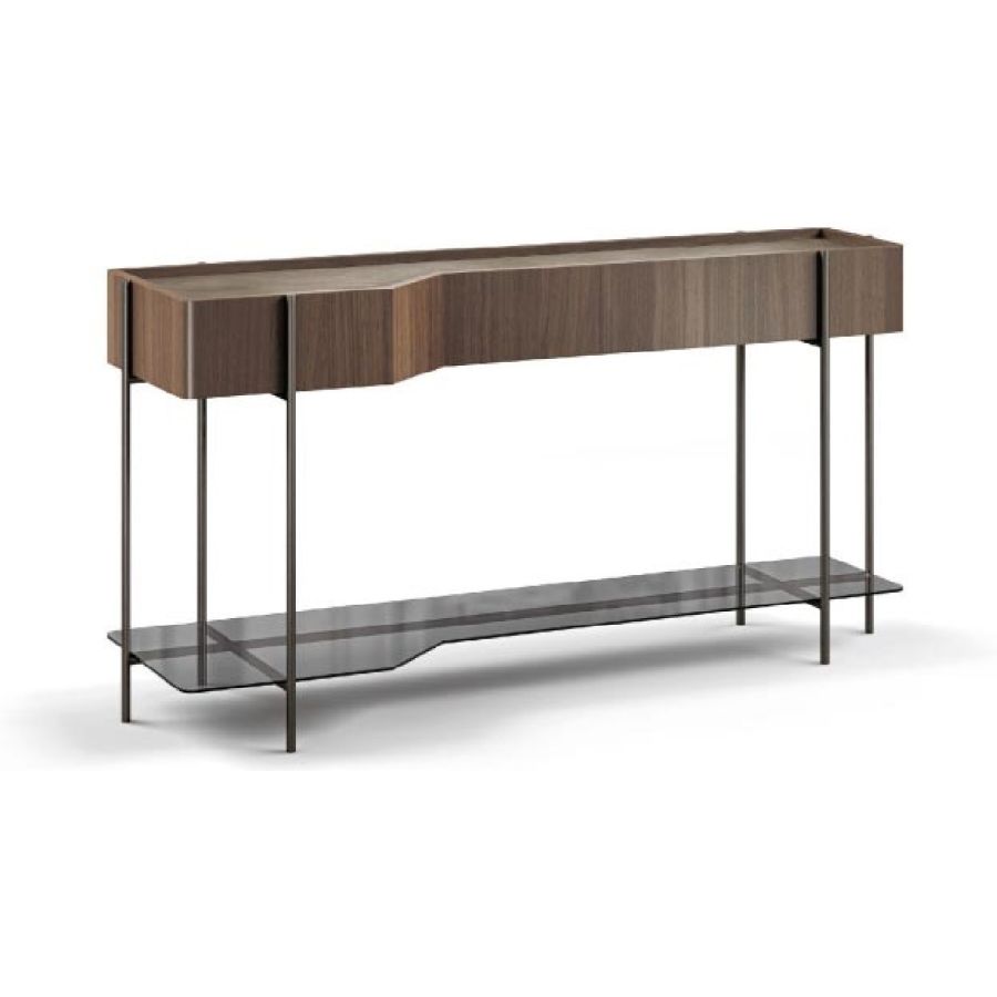 Console in black walnut veneered poplar plywood. Painted metal structure. Top in MDF coated poplar plywood with lacquered finish. Lower shelf in smoked glass.