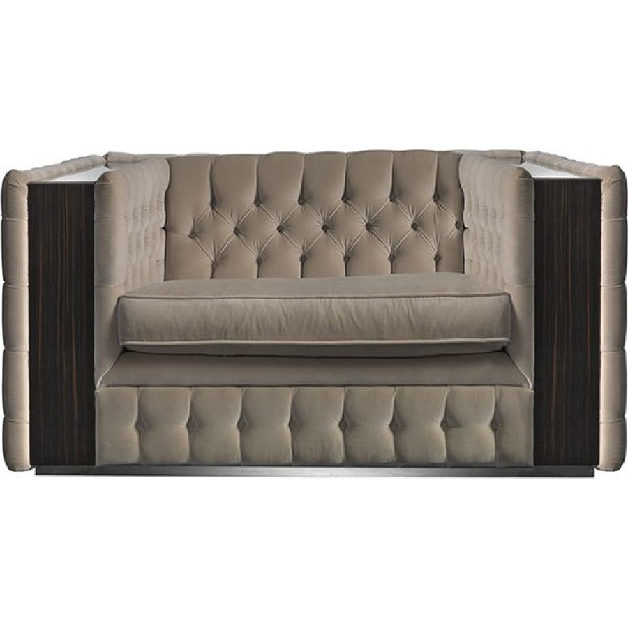 Armchair with wooden structure and feather padding with details in polyurethane foam. Base in polished steel. Stripes in shiny Ebony wood or in lacquered glass or in antique mirror with gold engravings. Upholstery in fabric or in leather, studded on both backrest and arms, inside and outside.