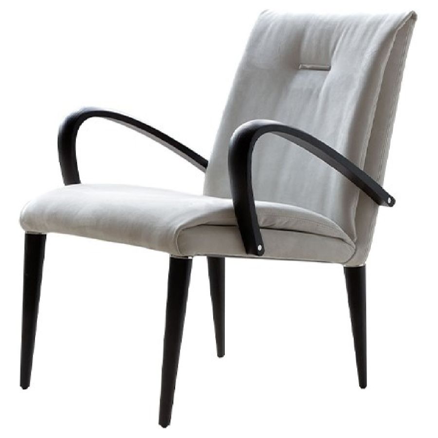 Armchair with internal metal structure and upholstery in leather, velvet or fabric. Shiny steel detail on the back. Legs in shiny nero beluga lacquered wood, Canaletto walnut or matt beluga Oakwood. Also available with wooden arms in Canaletto walnut or Beluga oakwood
