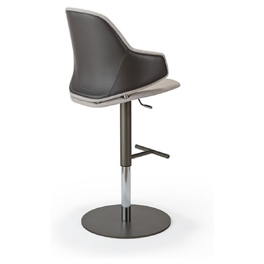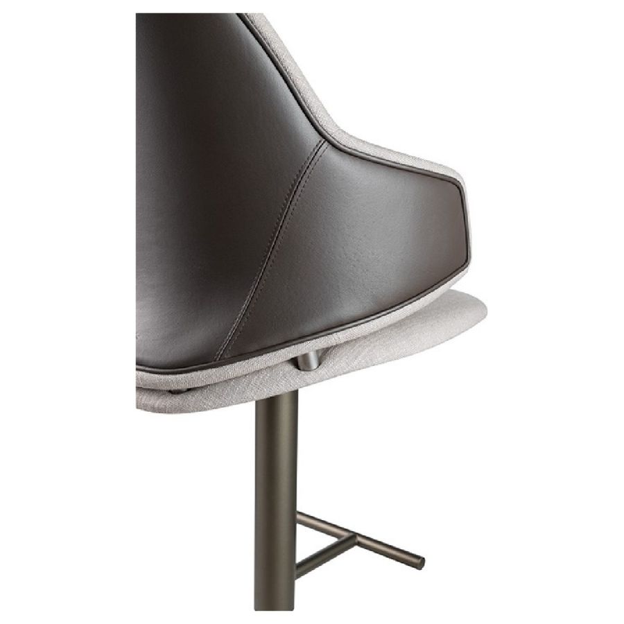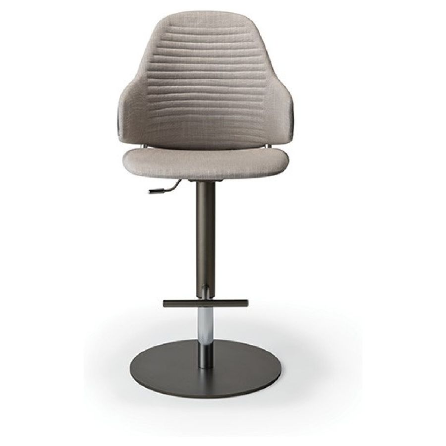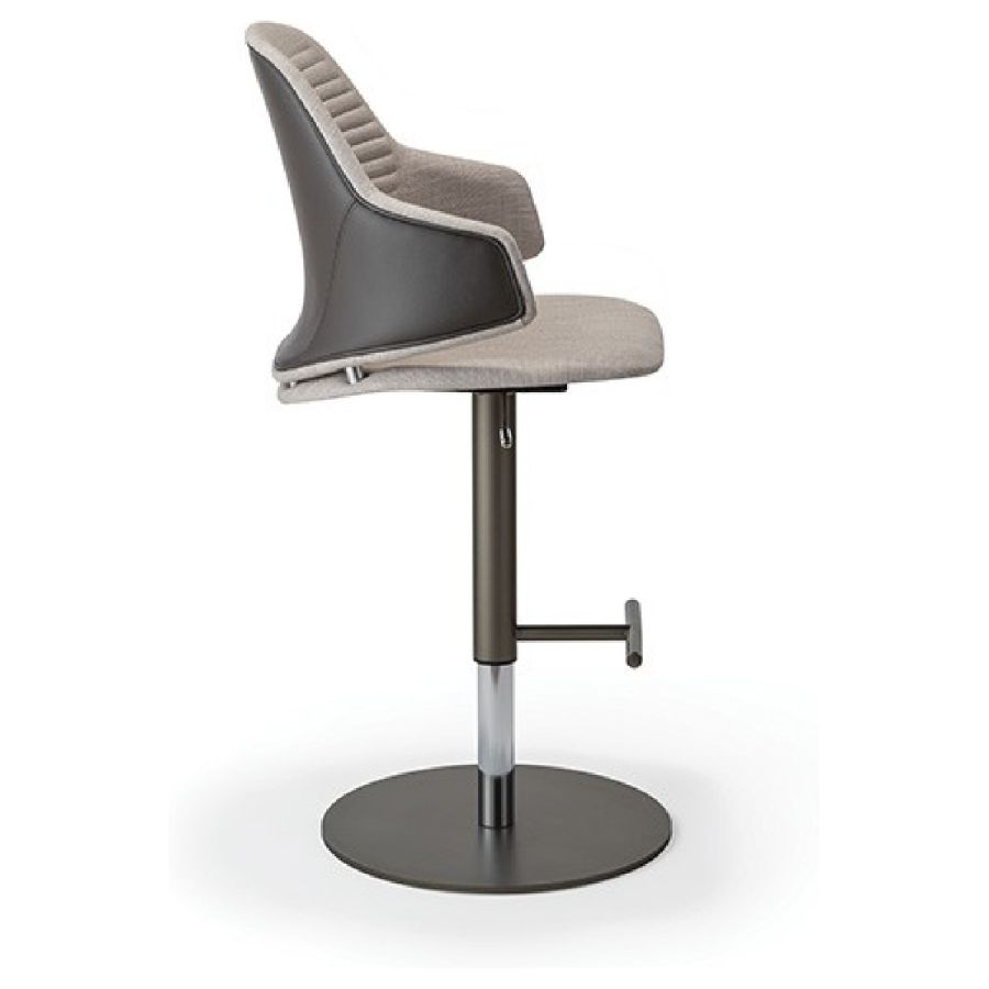 Stool with shell in resin and wood with upholstery in leather or fabric. Internal back with quilting. Adjustable metal base in bronze 100M, brass 104M, dark brass 105M and titanium 101M.