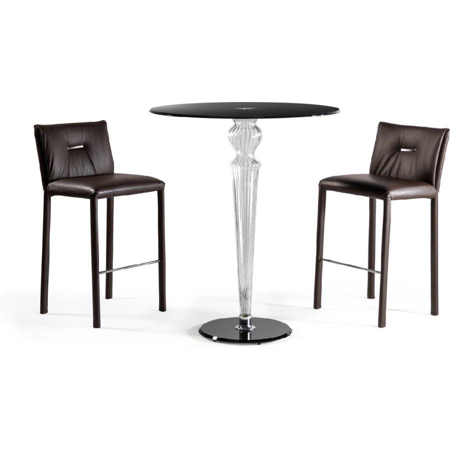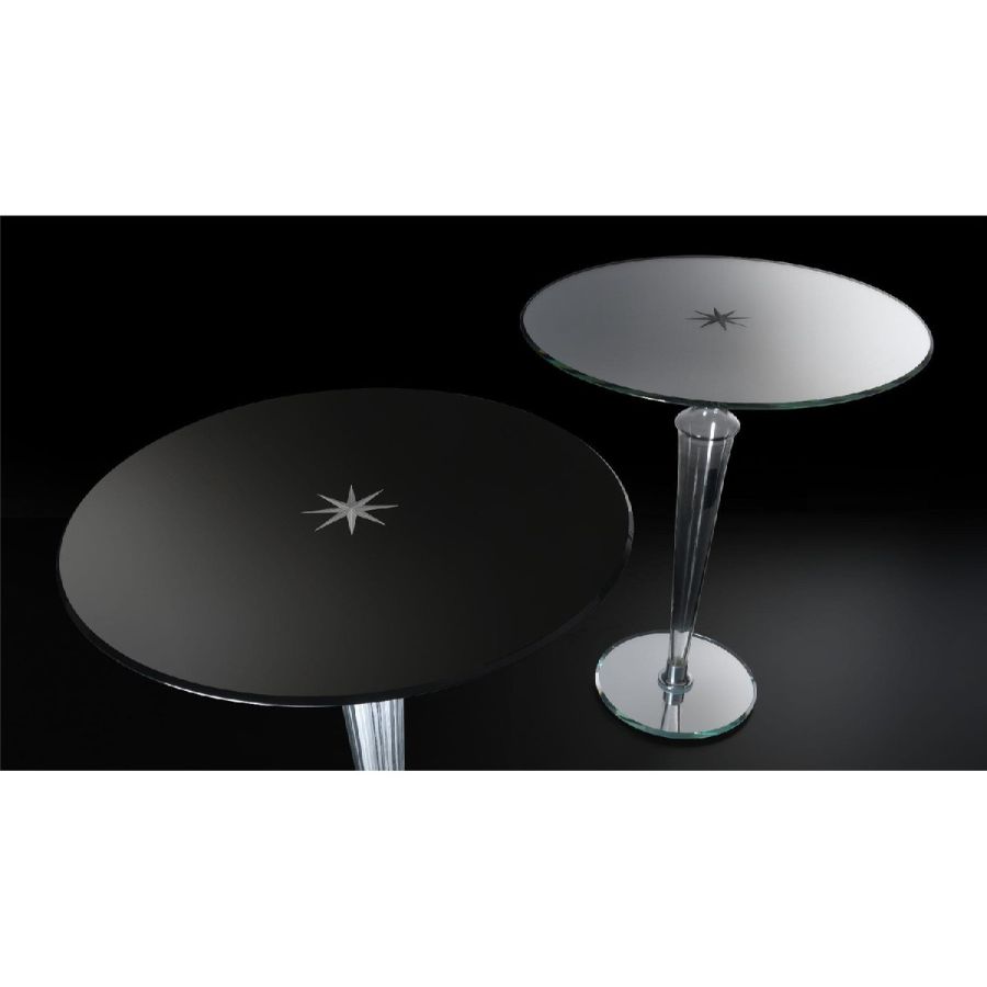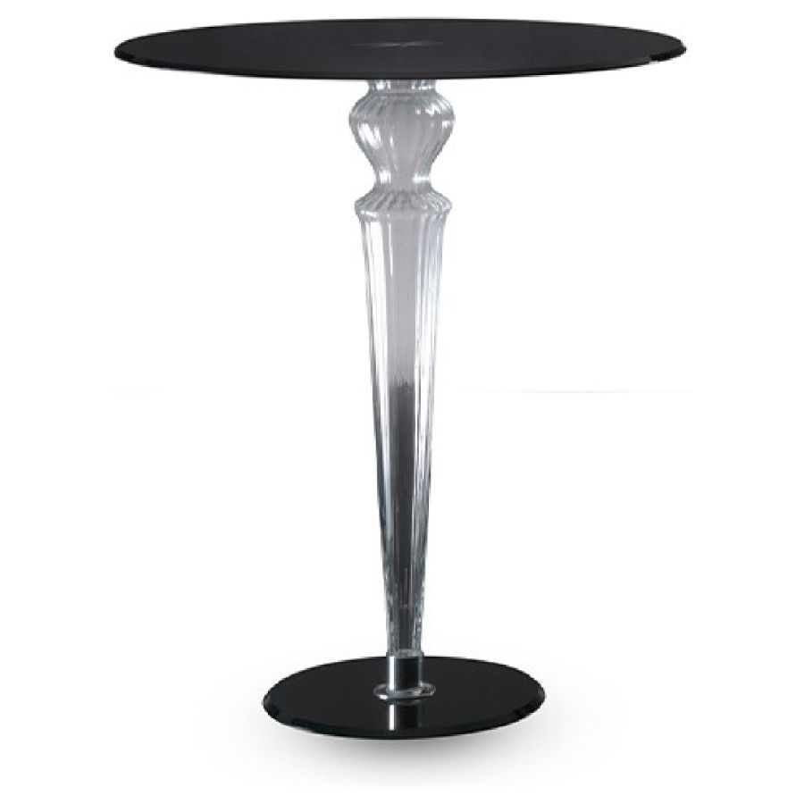 Bar table with leg in Murano glass smooth in transparent or coloured finish. Fixing part in chromed aluminium on a mirror glass base. Top with bevel in transparent glass.