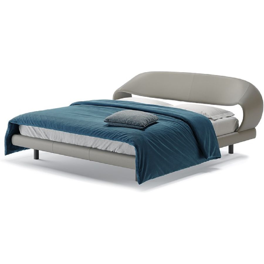 Bed with curved headboard and sides upholstered in fabric or in leather. Legs in matt black finish.