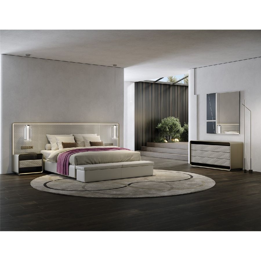 XL version of the OH bed which maintains the rounded frame in Bronze, Brass, Dark Brass, Titanium finish with LED lighting and touch switch. Padded headboard upholstered in leather or fabric with quilting. Plain bed frame. Optional: wooden shelf with drawer in Bronze finish and top in Marmoreflex; arrangement to install switches and sockets, storage with lifting slat.