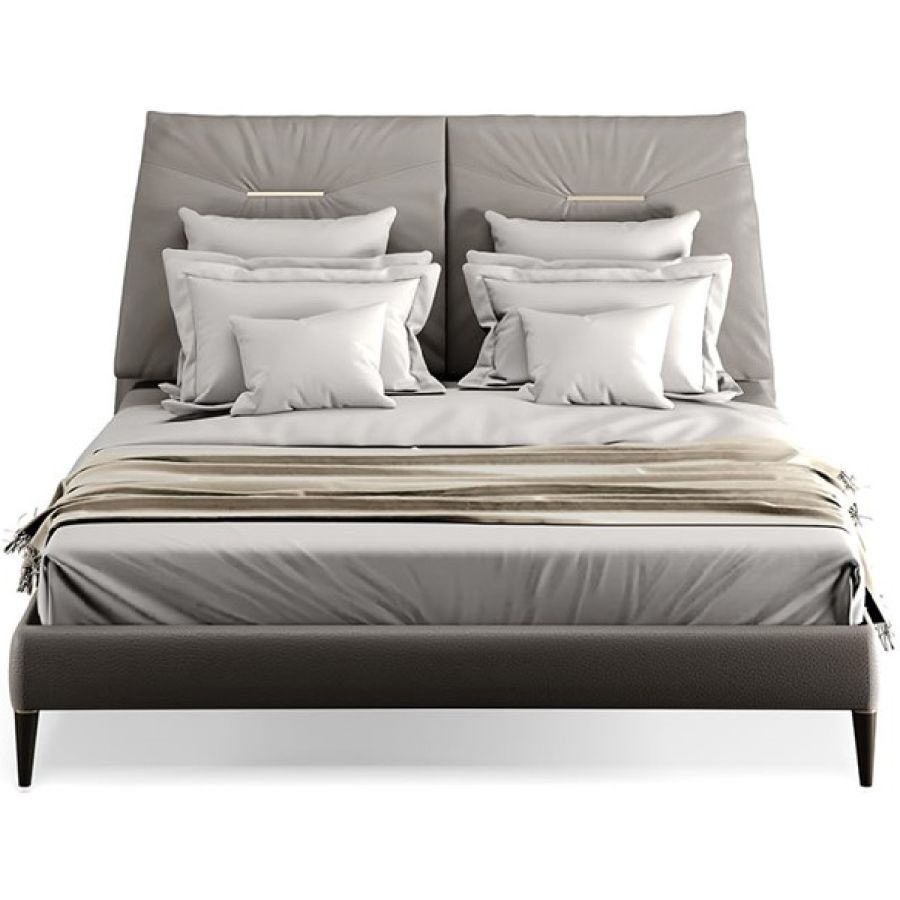 Padded bed upholstered in leather or fabric with details in shiny steel. Wooden legs in Canaletto walnut or Beluga oakwood