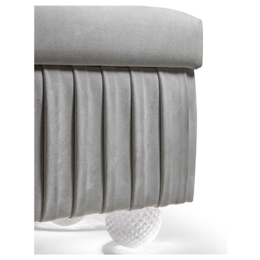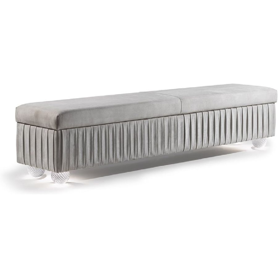 Bench with storage covered in fabric or in leather with pleated working on the body. Plain lid. 4 sphere-legs in transparent or gold Murano glass with optional LED lighting.