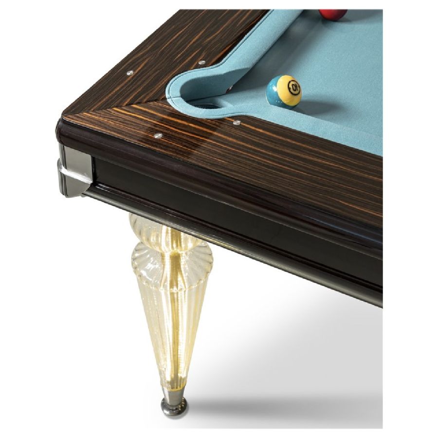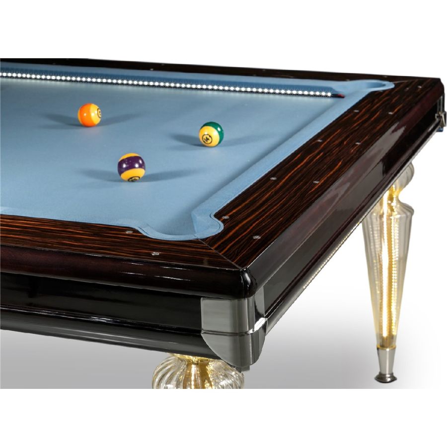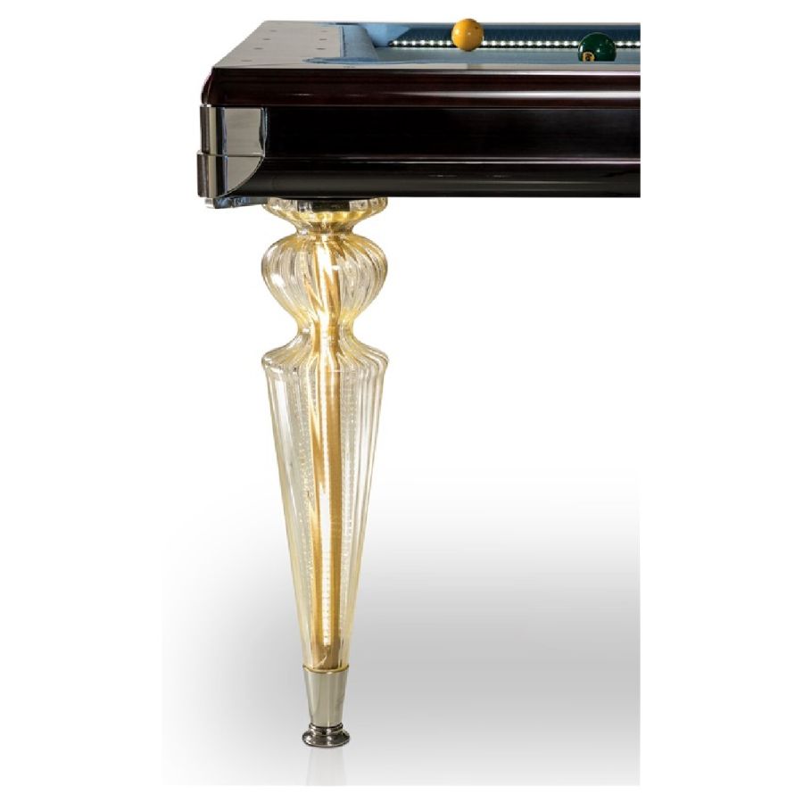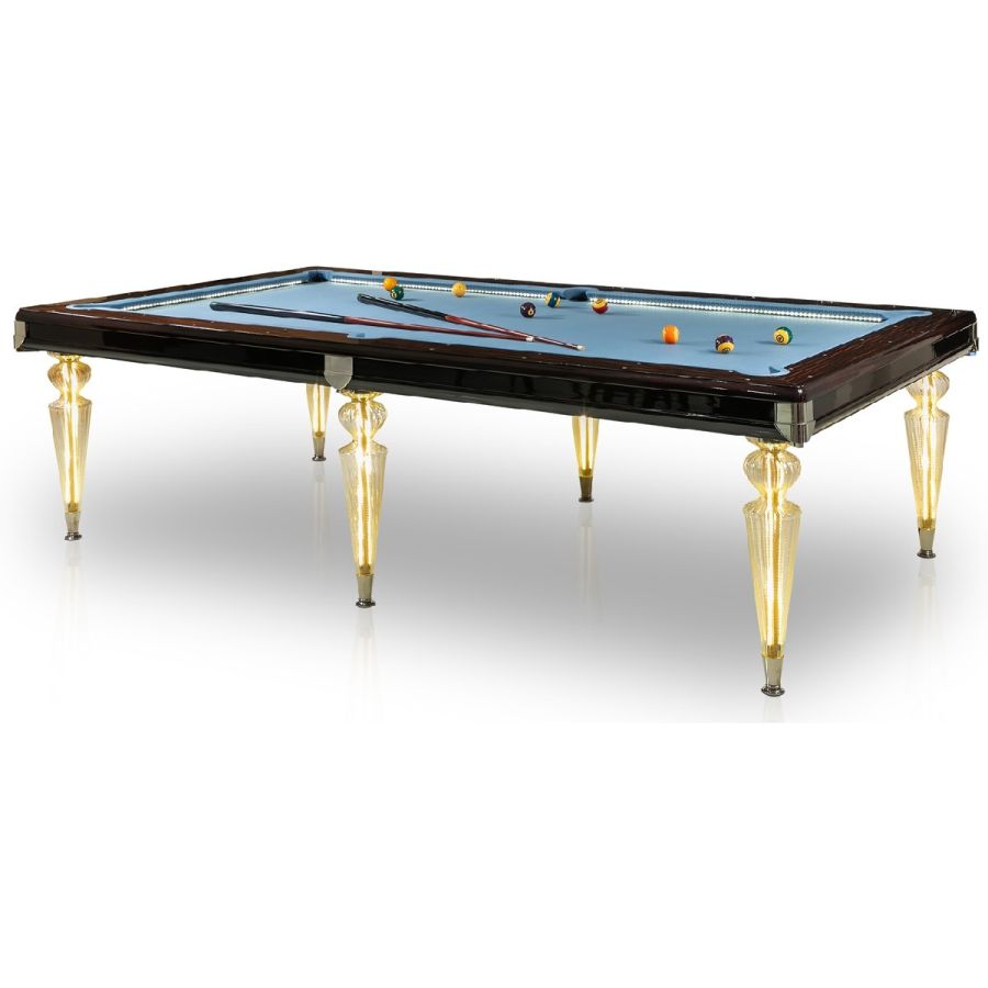 Billiard table with glass top covered in playing-felt. Shiny lacquered wooden structure. Legs in Murano glass, transparent, coloured or in Platinum finish. Optional LED lighting for the top and for the legs and cues holder in mirror glass.