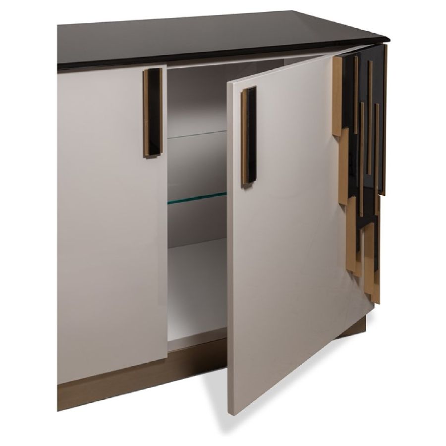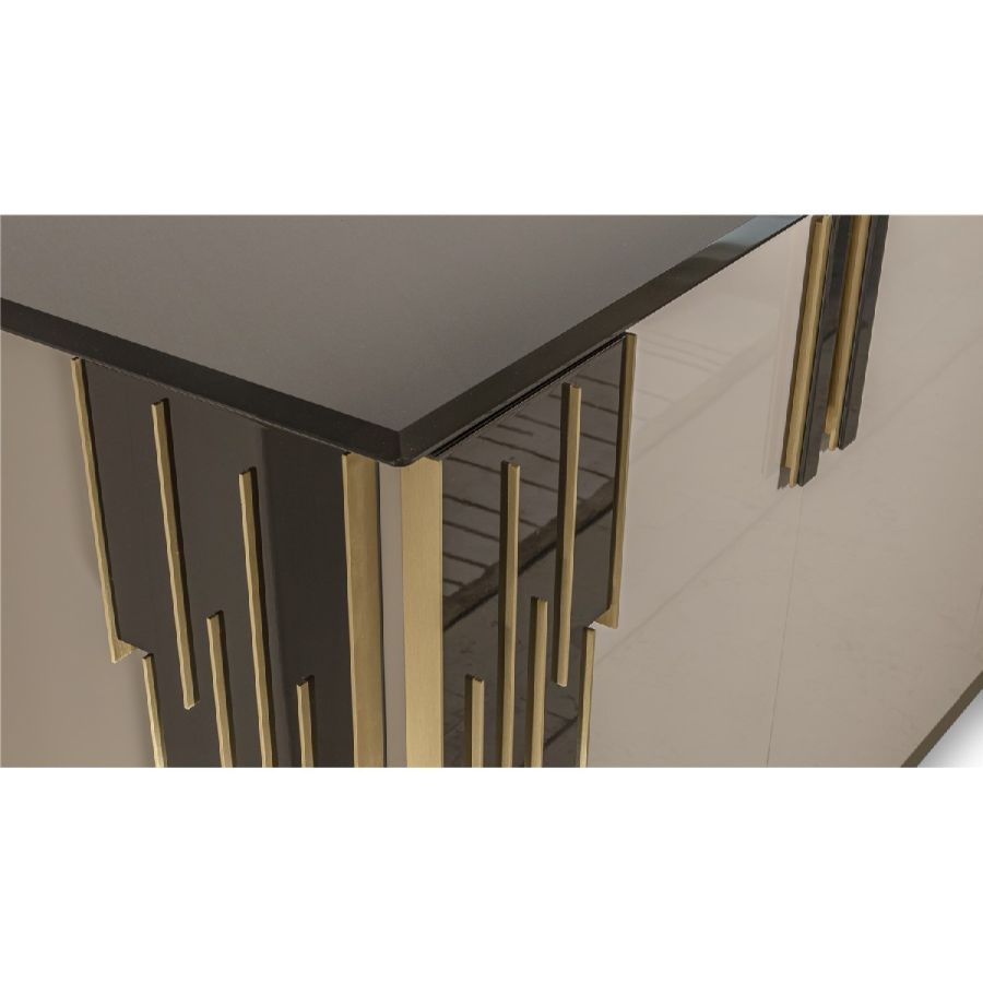 Buffet with wooden structure shiny lacquered finish. Top in lacquered glass and shaped decorations in shiny lacquered wood with details in glazed-gold metal. Plinth in brass finish. 4 doors with metal handles in glazed gold finish and glass detail.