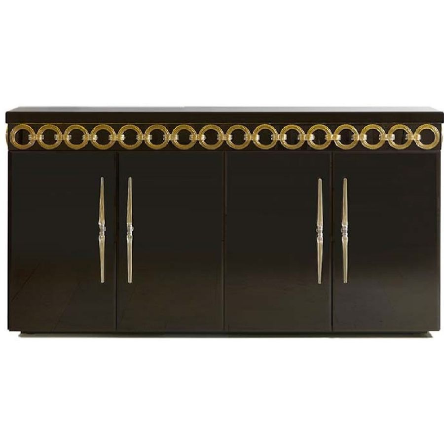Sideboard with external covering in mirror glass or in lacquered glass. Decoration with transparent, gold or coloured Murano glass rings. Internal back and shelves in cedar-wood. Optional Murano glass handles and LED lighting on the decoration.