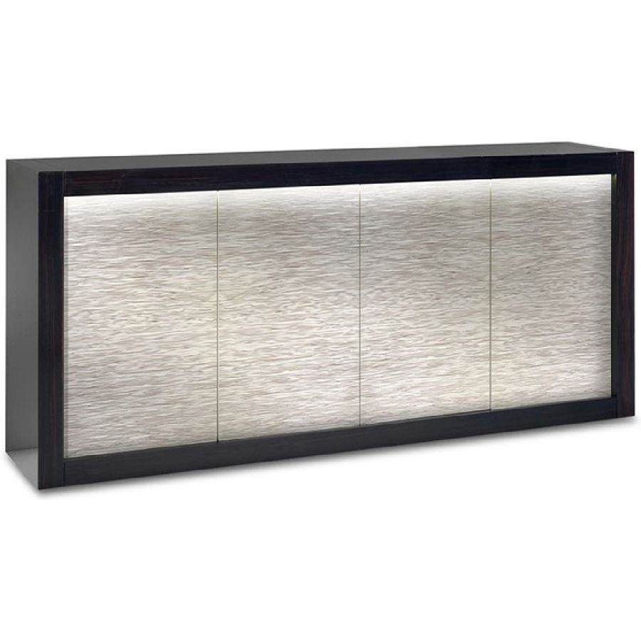 Sideboard with structure in shiny lacquered wood with applications of bevelled lacquered glass or in shiny ebony wood. Doors in glass with DUNE pattern design and push-pull opening. Equipped with glass shelves and LED-lighting under the top.