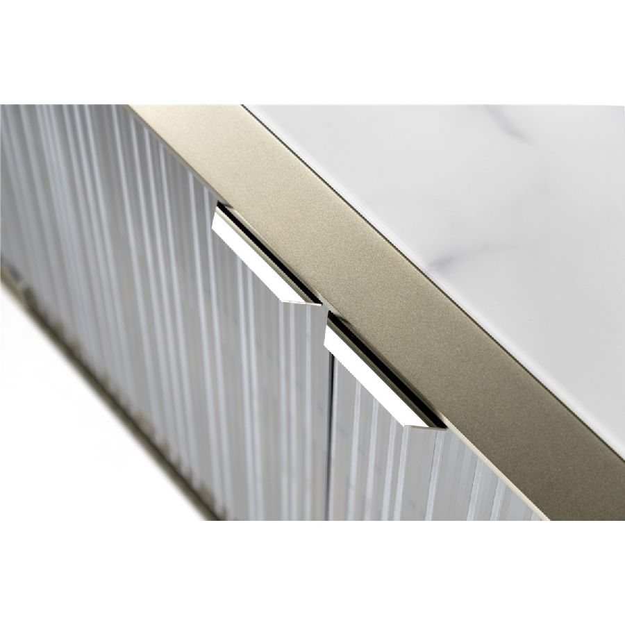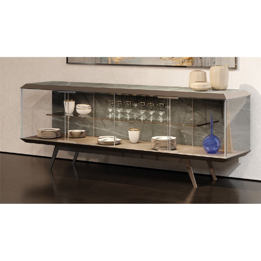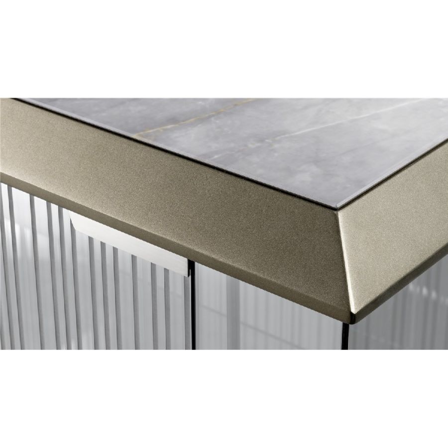 Buffet with bottom, top and legs in Bronze finish. Marble glass top cover. 4 hinged doors and Led strip under the top with light switch sensor under the base. Available in 2 versions: with structure in Supersilver glass with the 2 central doors and a section of the back with London engravings, very suitable as room divider, or with structure in extra-clear glass and back in MarmoReflex.