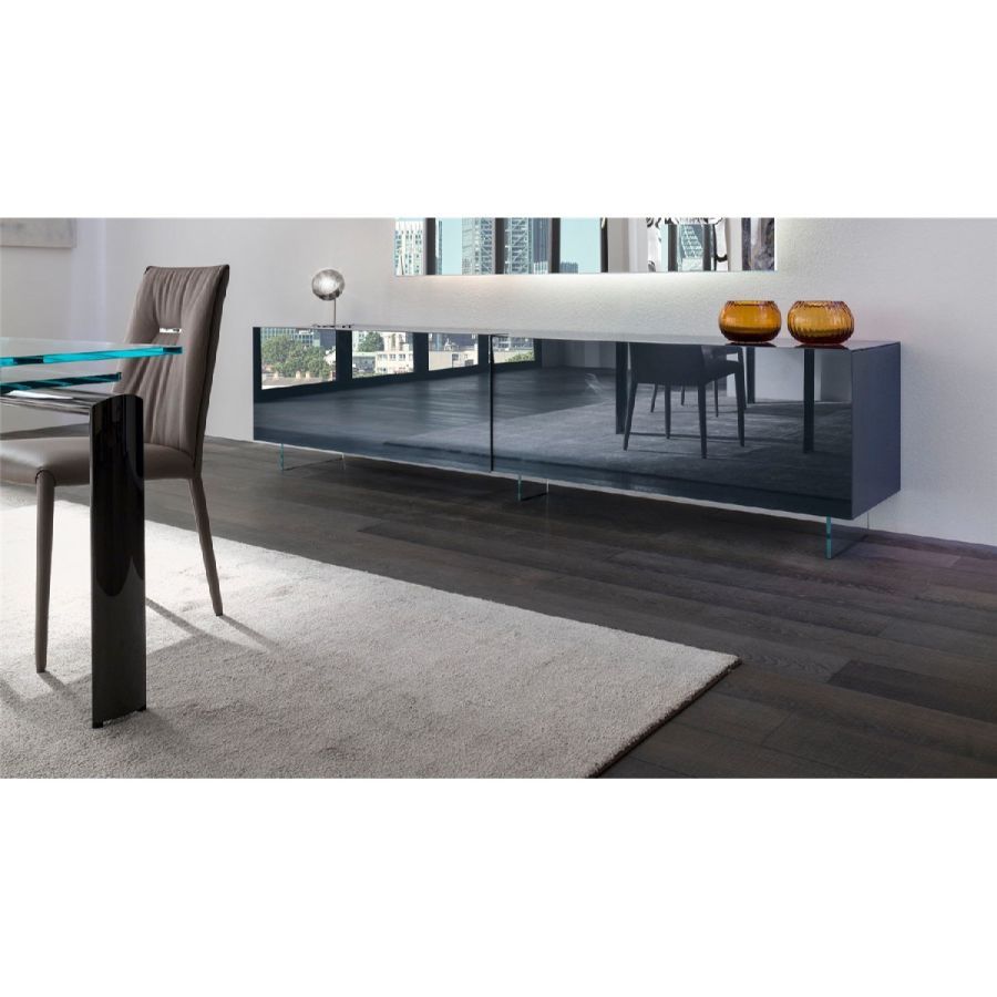 Sideboard with 2 sliding doors covered in lacquered or etched lacquered glass. Optional legs in transparent glass or in brass or titanium finished metal.