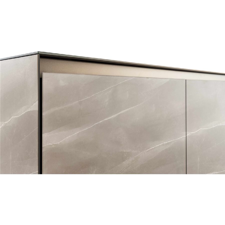 Low sideboard with 4 doors. Wooden structure covered in lacquered or etched lacquered glass, Marmoreflex or Legnoreflex. Profile and plinth in Bronze finisch.