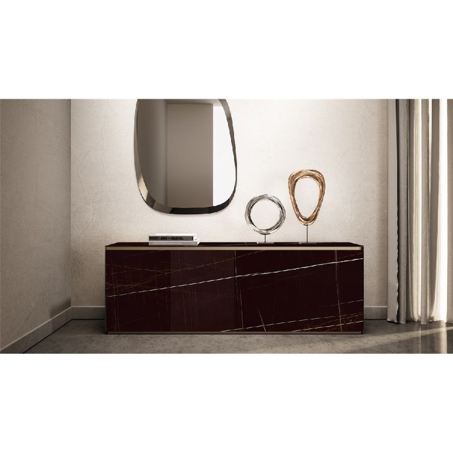 Sideboard with 4 doors. Wooden structure covered lacquered or etched lacquered glass, or in Marmoreflex/Legnoreflex. Profile and plinth in Bronze finish.