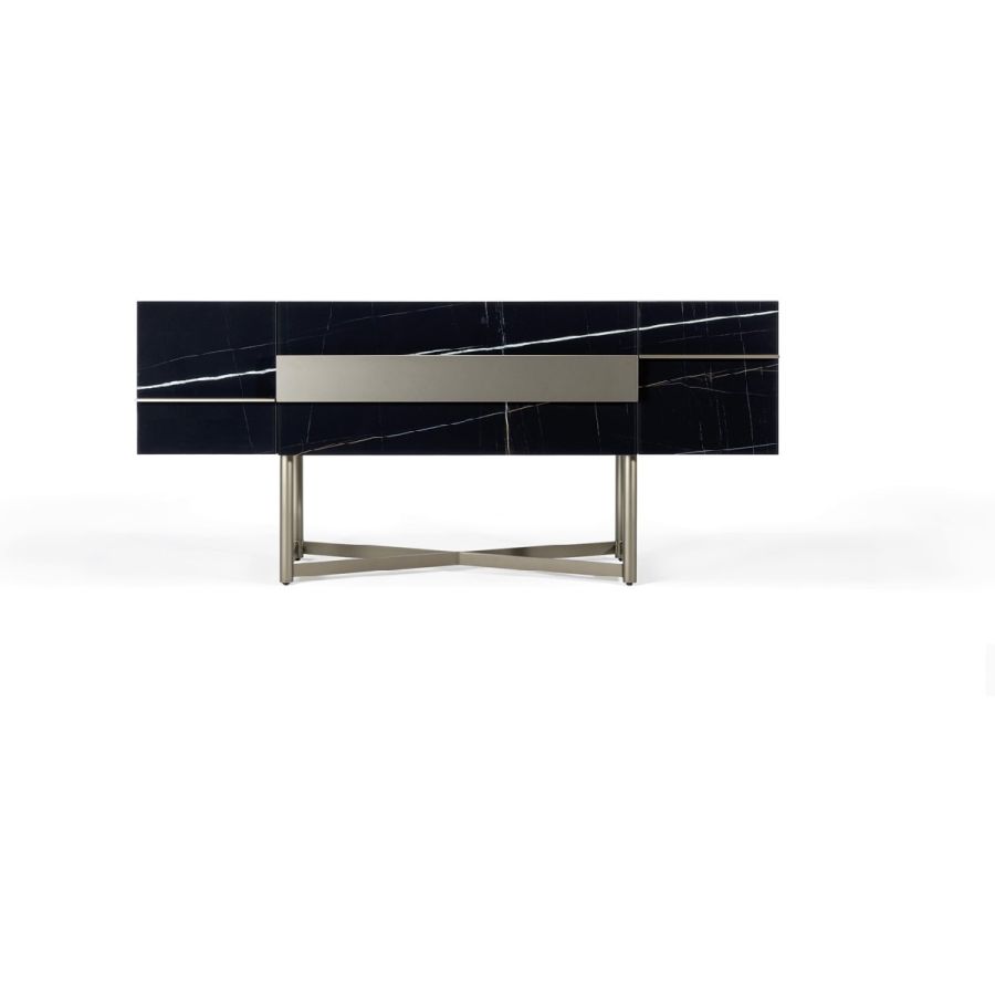 Sideboard with wooden structure covered in Marble glass. Handle details and metal base in Bronze finish.