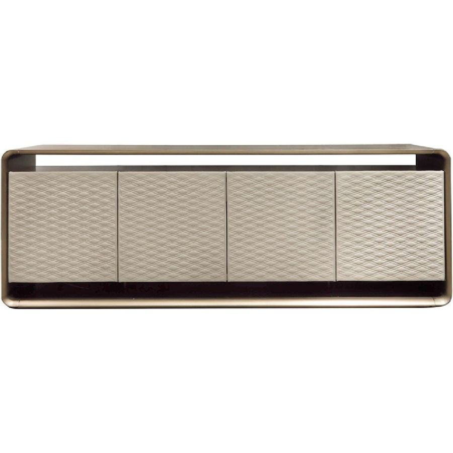 Sideboard with structure in shaped rounded wood in the metallic finishes Bronze, brass or Titanium 4 suspended doors with push-pull opening available in shiny ebony, Canaletto walnut, oakwood Beluga finish or covered with leather with quilting. glass shelves in the side spaces and optional drawer in the central compartment.