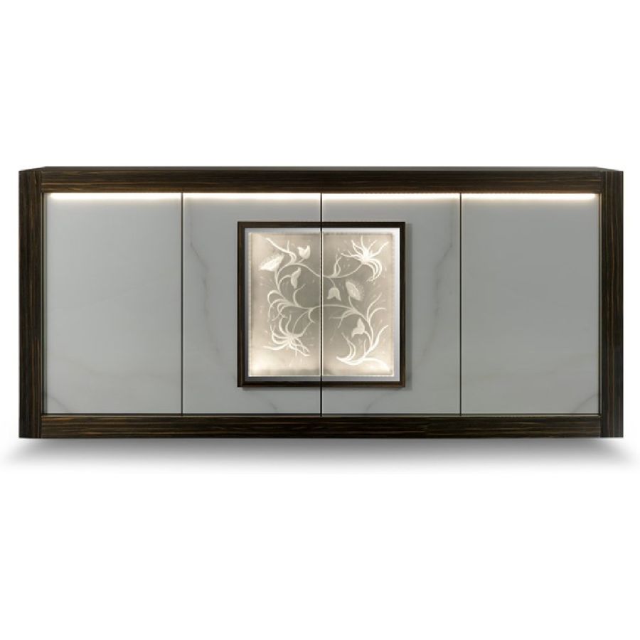 Sideboard with LED lighting under the top. Structure in shiny lacquered wood with application of bevelled lacquered glass or in shiny ebony wood. Doors covered in lacquered glass or in Marble glass. Glass tile with artistic engravings on the central doors