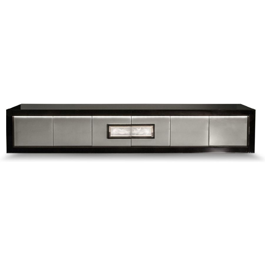 Low sideboard with LED lighting under the top. Structure in shiny lacquered wood with application of bevelled lacquered glass or in shiny ebony wood. Doors covered in lacquered glass or in Marble glass. Glass tile with engravings on the central doors.