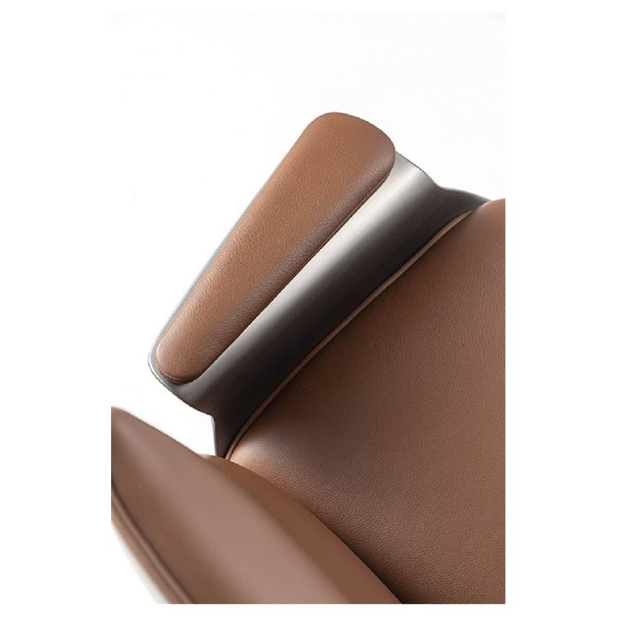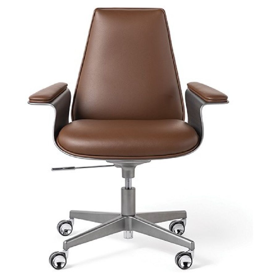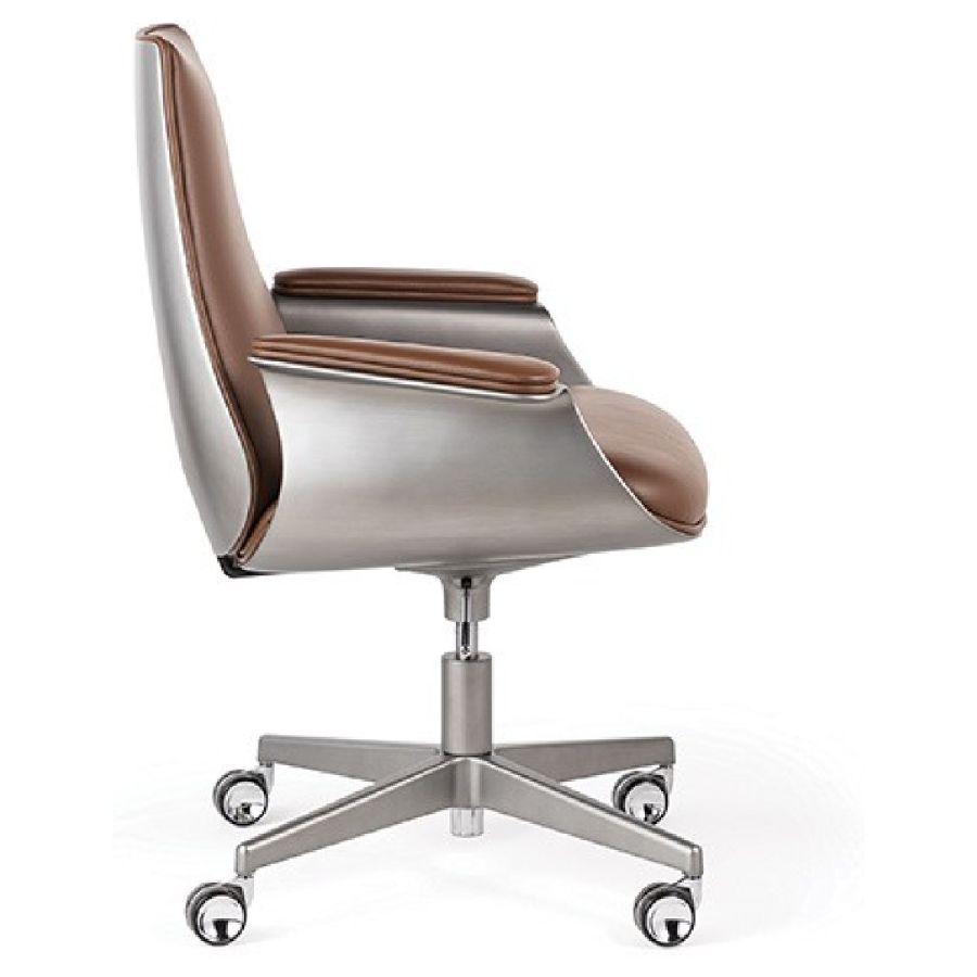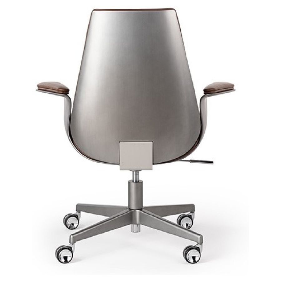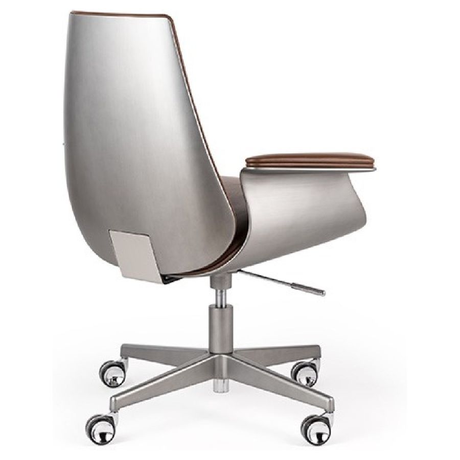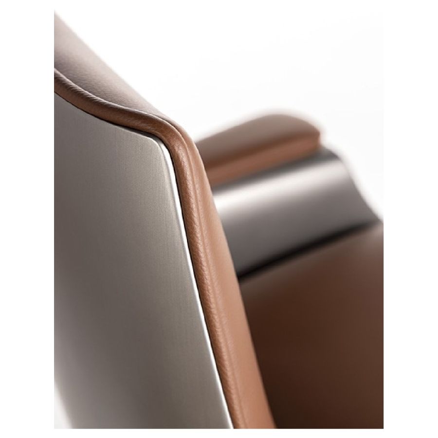 Office chair with external shell in Bronze 100M, brass 104M, dark brass 105M or Titanium 101M finish. Upholstery in leather. Base with wheels in bronze 100M, brass 104M, dark brass 105M or titanium 101M finish.