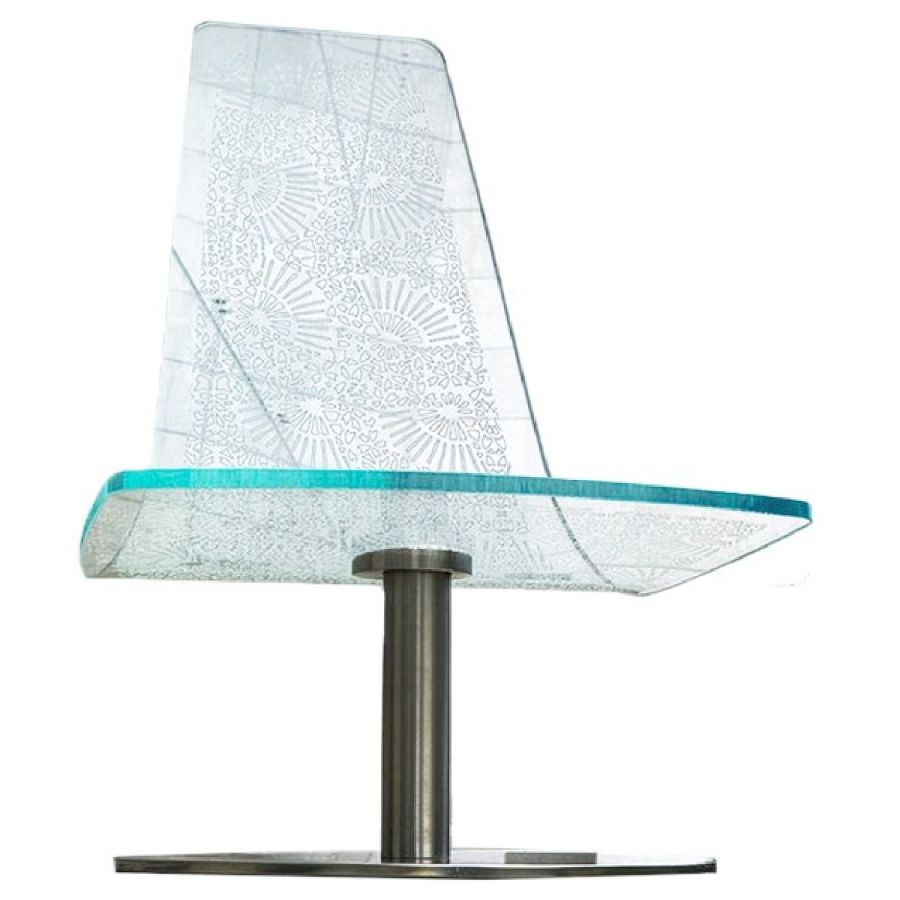 Chair in 19 mm thick glass curved and decorated through an innovative texture digital print system. Available with high or low back and in extraclear glass. Swivel steel base.