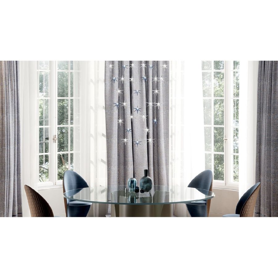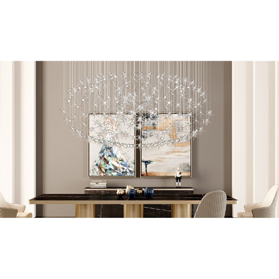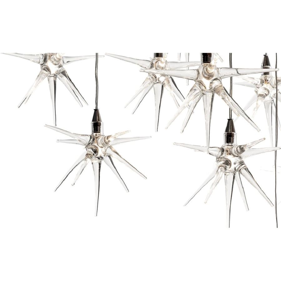 Chandelier with support in white or black lacquered or mirror glass and pendant stars in blown borosilicate glass, transparent or coloured with LED. It is possible to realize customized versions for dimensions, length and shape.