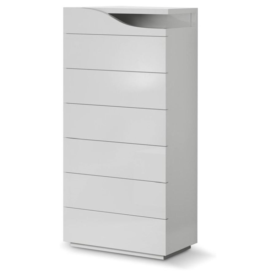 High chest of drawers in shiny lacquered wood or in Canaletto Henné finish. Top drawer with shaped front and open compartment