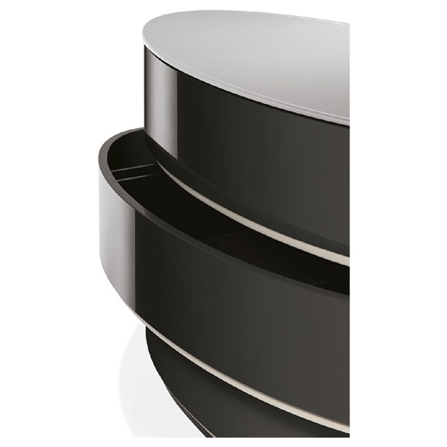 Chests of 3 drawers in curved wood in shiny lacquered finish. Top in lacquered glass. Cat.C leather details between the drawers.
